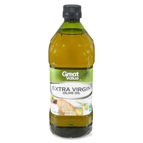 Details Ingredients Extra Virgin Olive Oil. Product features Enjoy the mild taste of our 100% Extra Virgin Olive Oil! Dress up your favorite Italian recipes by adding an easy-pour drizzle of Olive Oil to your favorite salad dressings, pasta sauces and marinades. Toss with noodles, fresh garlic and Parmesan cheese for a simple and satisfying pasta dish. Pair with fresh bread as a heart healthy alternative to butter, or blend up some flavorful pesto. The large bottle is great for those who consistently use olive oil in every day cooking or for large events. As a staple of the Mediterranean diet, olive oil is loaded with antioxidants and anti-inflammatory properties and is proven to promote a heart healthy lifestyle. Great Value Classic Olive Oil is inspired by the heart healthy Mediterranean diet, resulting in a fragrant and flavorful blend that the whole family is sure to savor. Great Value products provide families with affordable, high quality grocery and household consumable options. With our wide range of product categories spanning grocery and household consumables, we offer you a variety of products for your family's needs. Our products are conveniently available online and in Walmart stores nationwide, allowing you to stock up and save money at the same time. Great Value 100% Extra Virgin Olive Oil, 51 fl oz: Perfect for your cooking needs Great for salads & dipping Great bottle shape with gripping area Kosher Special Features No trans fat Net Quantity of Content 100 X 1 Tbsp (15mL)