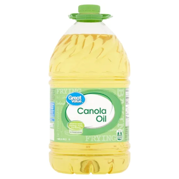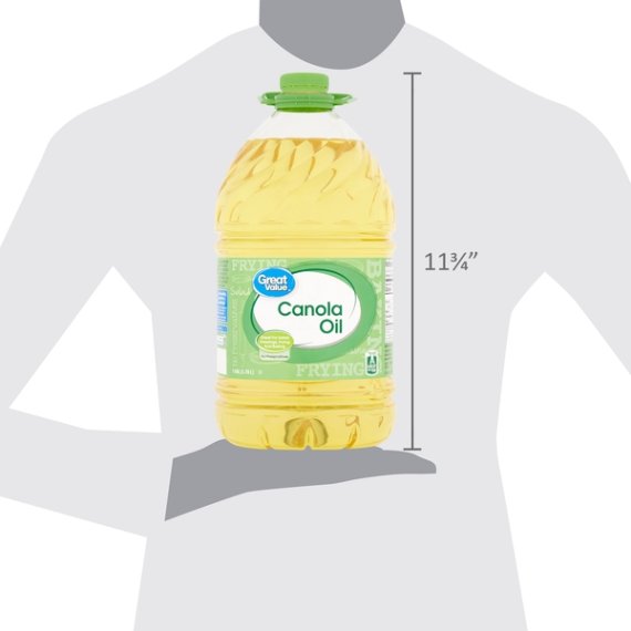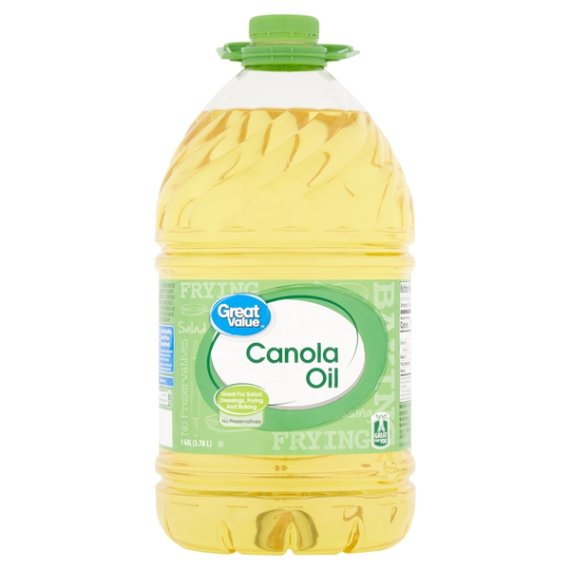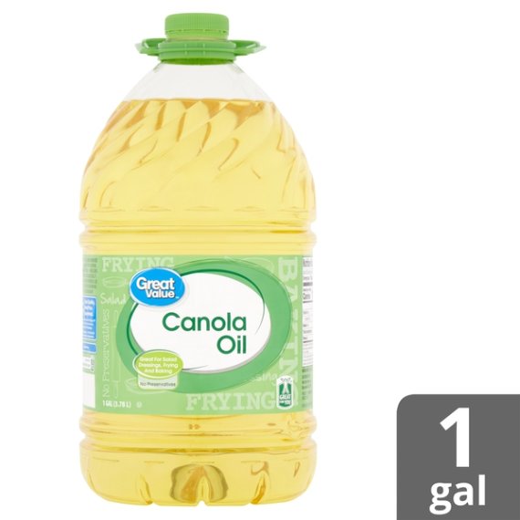 Details Ingredients CANOLA OIL. Product features Great Value Canola Oil is great for frying, baking, making salad dressings, and more! Having a product that mixes well with other ingredients and is light on taste is essential to any kitchen. The delicate aroma and smooth natural essence of this canola oil will make sauteing and stir-frying a breeze. Learn how to make your own mayonnaise, mix up a new dressing or dip, or add a delicate crispy flavor and texture to your favorite homemade deep-fried foods. Our slogan means you get the highest quality products at the most affordable prices, and this canola oil does not disappoint. This one gallon container has a screw top lid and plastic handle for added convenience. Our canola oil is also gluten free, sodium free, and cholesterol free with no preservatives added, so you know you're getting a best-in-class product. When you need a top-quality oil at a bottom-shelf price, reach for Great Value Canola Oil. Great Value products provide families with affordable, high quality grocery and household consumable options. With our wide range of product categories spanning grocery and household consumables, we offer you a variety of products for your family's needs. Our products are conveniently available online and in Walmart stores nationwide, allowing you to stock up and save money at the same time. Canola oil 1 gallon container No preservatives Great for frying and baking Gluten free, sodium free, and cholesterol free Special Features 100% pure Net Quantity of Content ABOUT 256 X 1 Tbsp