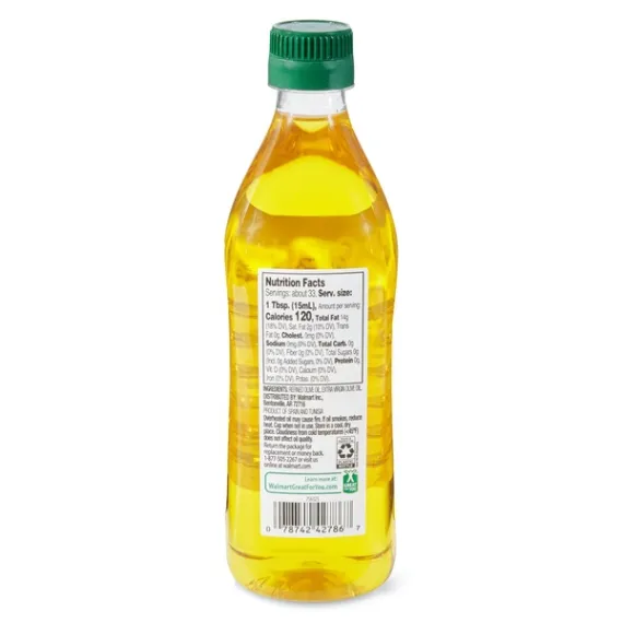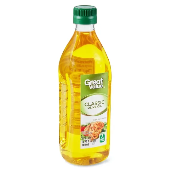Details Ingredients OLIVE OIL. Product features Great Value Classic Olive Oil is a great addition to any scrumptious meal or cooking situation both at home or in a professional kitchen. This bottle has a screw on top that will allow for you to easily come back to use this at a different point in time if needed. Olive oil goes great on top of salad or used to cook different meats to help prevent sticking to the pan. The taste will be light and delicious, and will go great with Italian American Cuisine dishes such as pasta. Be prepared for the next eloquently succulent meal you make with Great Value Classic Olive Oil. Great Value products provide families with affordable, high quality grocery and household consumable options. With our wide range of product categories spanning grocery and household consumables, we offer you a variety of products for your family's needs. Our products are conveniently available online and in Walmart stores nationwide, allowing you to stock up and save money at the same time Great Value Classic Olive Oil, 17 fl oz Shelf stable Works as a dressing or in a pan Goes great with pasta Great in marinades Great Quality, Great Price, Guaranteed. Special Features 0G trans fat per serving Net Quantity of Content ABOUT 33 X 1 Tbsp