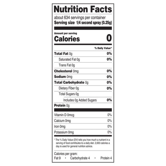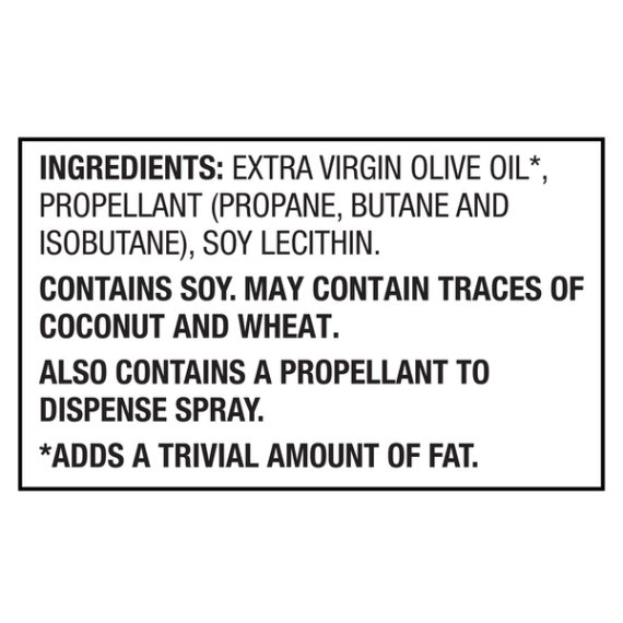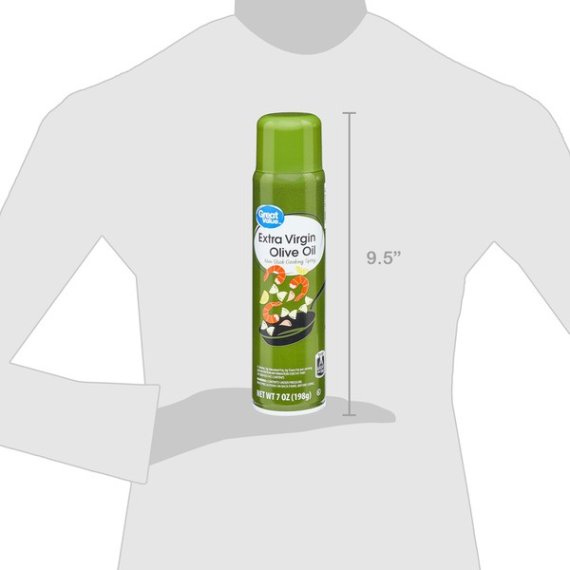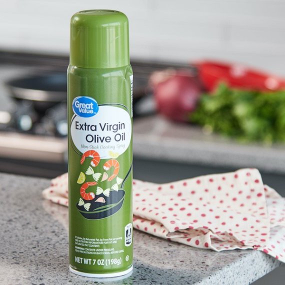 Details Ingredients EXTRA VIRGIN OLIVE OIL*, PROPELLANT (PROPANE, BUTANE AND ISOBUTANE), SOY LECITHIN. *ADDS A TRIVIAL AMOUNT OF FAT. Product features Great Value Olive Oil No Stick Cooking Spray is specially formulated to provide the ultimate no-stick cooking experience. This tasty, fat-free cooking spray is a great alternative to butter and margarine, as it prevents foods from sticking to pans and dishes. With zero trans-fat and calories per serving, this spray is a guilt-free solution to preparing eggs, pancakes, waffles, and grilled cheese sandwiches, as well as meats, fish, and vegetables. Experience the difference the difference in your cooking with Great Value Olive Oil No Stick Cooking Spray. Great Value products provide families with affordable, high-quality grocery and household consumable options. With our wide range of product categories spanning grocery and household consumables, we offer you a variety of products for your family's needs. Our products are conveniently available online and in Walmart stores nationwide, allowing you to stock up and save money at the same time. Great Value Olive Oil No Stick Cooking Spray, 7 oz: Prevents foods from sticking to pans and dishes 0 grams of trans fat per serving; 0 calories per serving Great alternative to butter or margarine 7 oz per can Use to prepare eggs, pancakes, waffles, and grilled cheese sandwiches, and more Special Features No stick Net Quantity of Content 659 X 0.25g