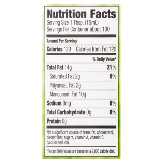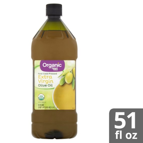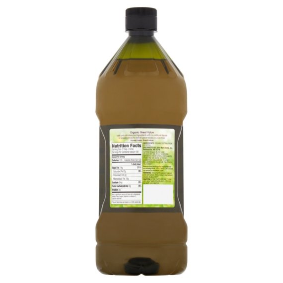 Details Ingredients ORGANIC EXTRA VIRGIN OLIVE OIL. Product features Great Value Organic Extra Virgin Olive Oil is a kitchen staple for home chefs everywhere. With 100 servings packed into this 51-fluid-ounce bottle, you will always have delicious, high quality oil on hand for lunch, dinner, or a variety of delectable appetizers and tasty snacks. This rich and decadent olive oil is first-cold pressed to create its pure, superior flavor. Serve alongside warm bread, savory herbs, and grated parmesan cheese for an Italian staple dish, or drizzle it over buffalo mozzarella, vine-ripened tomato, and fresh basil for a traditional caprese salad. Perfect for salad dressings, homemade pesto sauce, pan sauteing, and more, the uses are endless for this wonderfully delicious accompaniment to any dish. The oil is made using only wholesome ingredients with no artificial flavors or preservatives so you know you're only getting the best there is to offer. Great Value Organic Extra Virgin Olive Oil is certified USDA organic. Organic Great Value uses only wholesome ingredients with no artificial flavors or preservatives to deliver great foods you can trust. Honest taste. Great value. Great Value Organic offers a wide-range of USDA certified organic foods that are hand-selected to meet our high standards as well as yours. We use wholesome ingredients without artificial flavors or preservatives to deliver great food you can trust at an affordable price. Fill your table with organic foods your family deserves without draining your budget. Great Value Organic Extra Virgin Olive Oil, 51 fl oz: Certified USDA Organic First cold pressed No artificial ingredients 100 servings per bottle Net Quantity of Content ABOUT 100 X 1 Tbsp