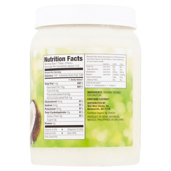Details Ingredients ORGANIC REFINED COCONUT OIL. Product features A healthy, delicious alternative to other oils, Great Value Organic Naturally Refined Coconut Oil is certified USDA organic, the ultimate baking essential and a solid foundation to any recipe. It can withstand higher cooking temperatures than unrefined coconut oil, has a neutral aroma and offers the same health and beauty benefits. It contains no artificial ingredients or preservatives. This naturally refined coconut oil is cold pressed and comes packaged in a 56oz jar. The pure formula is non-GMO, chemical free and heart healthy. Cook up fresh-tasting popcorn and baked goods, or use it to fry chicken and fish. Coconut oil may even be used as a natural skin moisturizer. Recharge your skin with the highest form of long lasting hydration. It eases poison ivy and eczema. If you are looking for a natural cleaning product, it cleans and polishes safely and organically. A great recipe for all your cooking, health, beauty and household needs, Great Value Organic Naturally Refined Coconut Oil is good for you both inside and out. Organic Great Value uses only wholesome ingredients with no artificial flavors or preservatives to deliver great foods you can trust. Honest taste. Great value. Great Value Organic offers a wide-range of USDA certified organic foods that are hand-selected to meet our high standards as well as yours. We use wholesome ingredients without artificial flavors or preservatives to deliver great food you can trust at an affordable price. Fill your table with organic foods your family deserves without draining your budget. 100% organic Non-GMO Chemical free Kosher 56oz jar Net Quantity of Content ABOUT 112 X 1 Tbsp