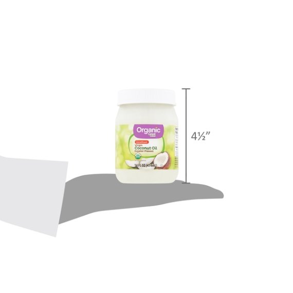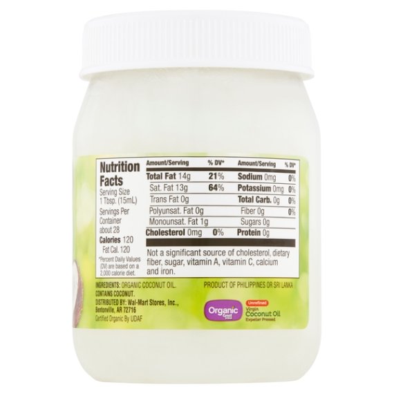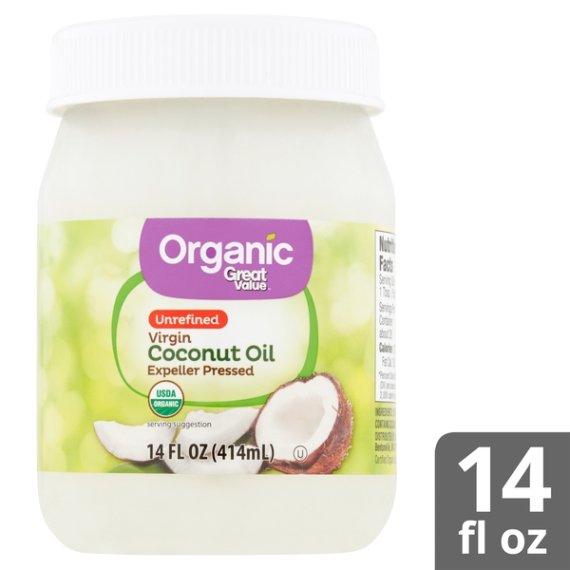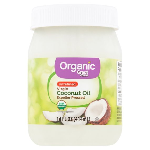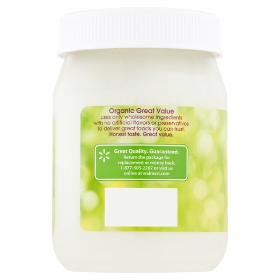 Details Ingredients ORGANIC COCONUT OIL. Product features For healthier cooking options and endless opportunities for beauty and household uses, Great Value Unrefined Virgin Coconut Oil is the certified USDA organic choice. The ultimate baking essential and a solid foundation to any recipe, it adds a tropical twist to your culinary repertoire. It contains no artificial ingredients or preservatives. This unrefined coconut oil is expeller pressed and comes packaged in a 14-ounce jar. The pure formula is free from trans-fat, sugar and cholesterol. Cook up fresh-tasting popcorn and baked goods, or use it to fry chicken and fish. Simply scoop out the needed amount, melt it and use it just like you would use oil or butter. Coconut oil may even be used as a natural skin moisturizer. Recharge your skin with the highest form of long lasting hydration. If you are looking for a natural cleaning product, it cleans and polishes safely and organically. Straight from the coconut to the jar, Great Value Organic Unrefined Virgin Coconut Oil is as real as it gets! Organic Great Value uses only wholesome ingredients with no artificial flavors or preservatives to deliver great foods you can trust. Honest taste. Great value. Great Value Organic offers a wide-range of USDA certified organic foods that are hand-selected to meet our high standards as well as yours. We use wholesome ingredients without artificial flavors or preservatives to deliver great food you can trust at an affordable price. Fill your table with organic foods your family deserves without draining your budget. 100% organic virgin coconut oil Unrefined Gluten-Free 14oz jar Expeller pressed organic No artificial flavors or preservatives Net Quantity of Content ABOUT 28 X 1 Tbsp