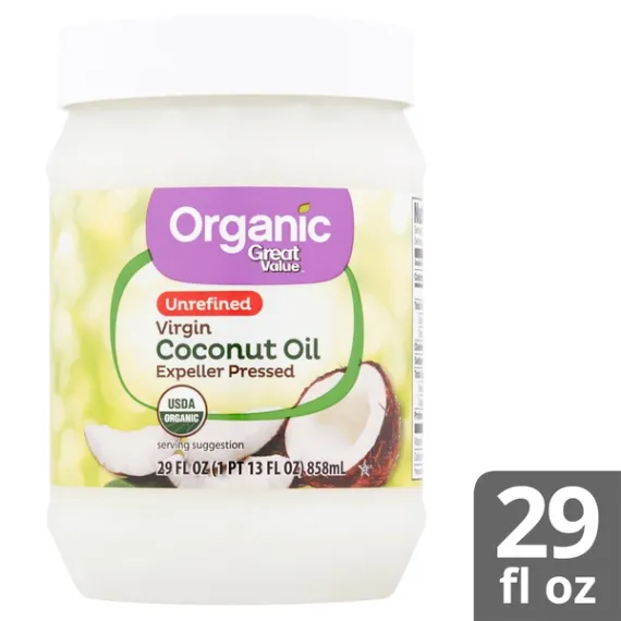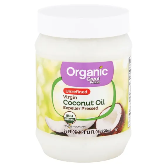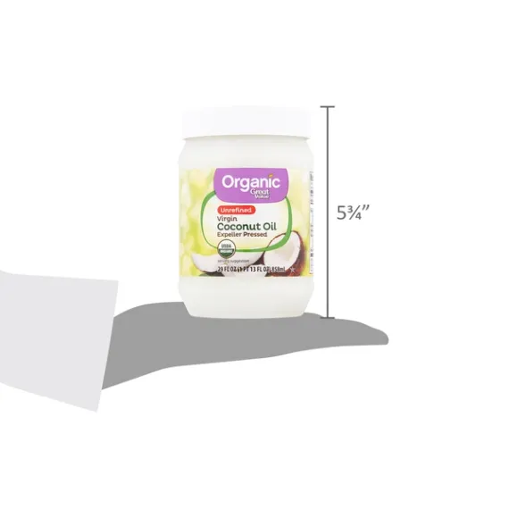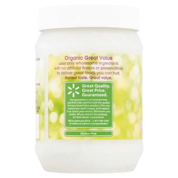 Details Ingredients ORGANIC UNREFINED VIRGIN COCONUT OIL. Product features For healthier cooking options and endless opportunities for beauty and household uses, Great Value Unrefined Virgin Coconut Oil is the certified USDA organic choice. The ultimate baking essential and a solid foundation to any recipe, it adds a tropical twist to your culinary repertoire. It contains no artificial ingredients or preservatives. This unrefined coconut oil is expeller pressed and comes packaged in a 24-ounce jar. The pure formula is free from trans-fat, sugar and cholesterol. Cook up fresh-tasting popcorn and baked goods, or use it to fry chicken and fish. Simply scoop out the needed amount, melt it and use it just like you would use oil or butter. Coconut oil may even be used as a natural skin moisturizer. Recharge your skin with the highest form of long lasting hydration. If you are looking for a natural cleaning product, it cleans and polishes safely and organically. Straight from the coconut to the jar, Great Value Organic Unrefined Virgin Coconut Oil is as real as it gets! Organic Great Value uses only wholesome ingredients with no artificial flavors or preservatives to deliver great foods you can trust. Honest taste. Great value. Great Value Organic offers a wide-range of USDA certified organic foods that are hand-selected to meet our high standards as well as yours. We use wholesome ingredients without artificial flavors or preservatives to deliver great food you can trust at an affordable price. Fill your table with organic foods your family deserves without draining your budget. 100% organic virgin coconut oil Unrefined Gluten-Free 24oz jar Expeller pressed organic No artificial flavors or preservatives Net Quantity of Content 56 X 1 Tbsp