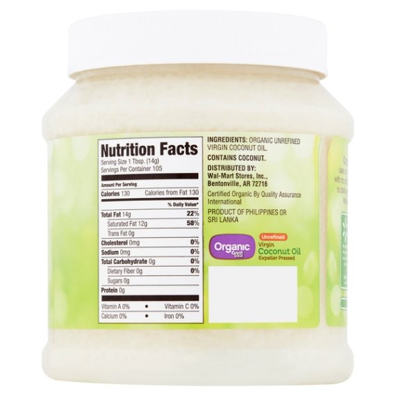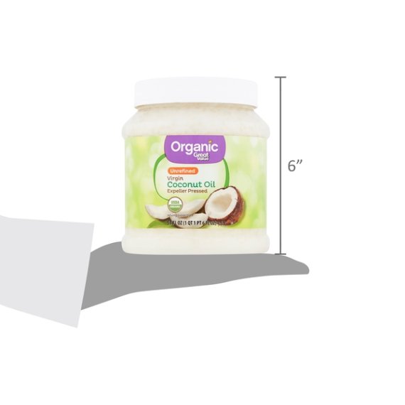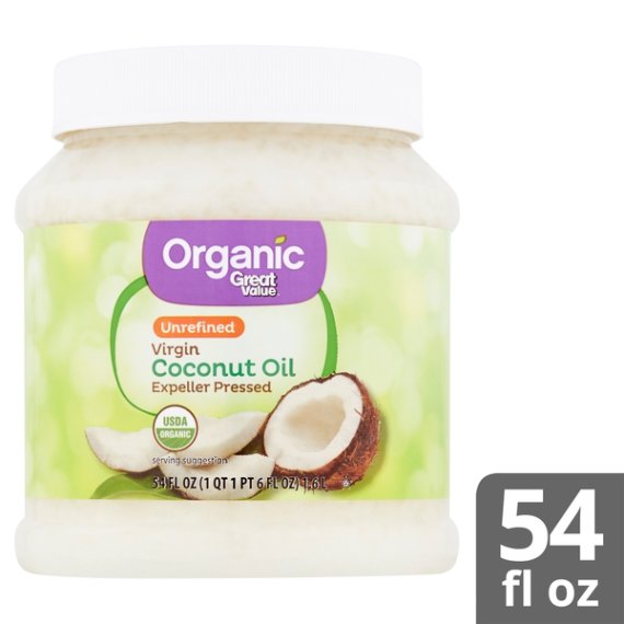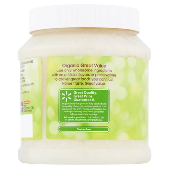 Details Ingredients ORGANIC UNREFINED VIRGIN COCONUT OIL. Product features For healthier cooking options and endless opportunities for beauty and household uses, Great Value Unrefined Virgin Coconut Oil is the certified USDA organic choice. The ultimate baking essential and a solid foundation to any recipe, it adds a tropical twist to your culinary repertoire. It contains no artificial ingredients or preservatives. This unrefined coconut oil is expeller pressed and comes packaged in a 54-ounce jar. The pure formula is free from trans-fat, sugar and cholesterol. Cook up fresh-tasting popcorn and baked goods, or use it to fry chicken and fish. Simply scoop out the needed amount, melt it and use it just like you would use oil or butter. Coconut oil may even be used as a natural skin moisturizer. Recharge your skin with the highest form of long lasting hydration. If you are looking for a natural cleaning product, it cleans and polishes safely and organically. Straight from the coconut to the jar, Great Value Organic Unrefined Virgin Coconut Oil is as real as it gets! Organic Great Value uses only wholesome ingredients with no artificial flavors or preservatives to deliver great foods you can trust. Honest taste. Great value. Great Value Organic offers a wide-range of USDA certified organic foods that are hand-selected to meet our high standards as well as yours. We use wholesome ingredients without artificial flavors or preservatives to deliver great food you can trust at an affordable price. Fill your table with organic foods your family deserves without draining your budget. 100% organic virgin coconut oil Unrefined Gluten-Free 54oz jar Expeller pressed organic No artificial flavors or preservatives Net Quantity of Content 105 X 1 Tbsp