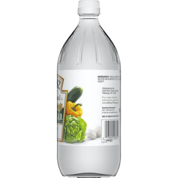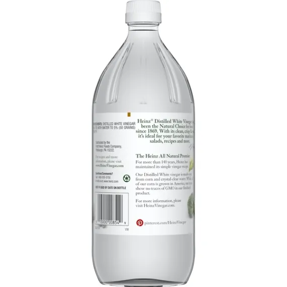 Details Ingredients Distilled White Vinegar Diluted With Water To 5% (50 Grains) Acidity. Product features Indispensable in the kitchen as a base ingredient for so many of the things we make, Heinz Distilled White Vinegar has the perfect acidity (5%) for canning and pickling. Heinz Distilled White Vinegar is made from sun-ripened corn and fresh water. It's ultra-filtered to guarantee sparkling clarity. As a marinade for meat, a base for dips or salad dressing, or to preserve fruit and veggie pieces from darkening, it's a whiz in the kitchen. You'll also love it as a natural cleanser for table tops and coffee makers. Collected through selective boiling and condensation from a fermented mixture of American-grown corn and clear water Just the right amount of acidic (5%) for canning and pickling Easy to handle, reclosable bottle to avoid spillage We like to keep things Kosher here, at Heinz Manufactured in the USA Special Features 5% acidity Net Quantity of Content 63.0 X 1 Tbsp (15ml)