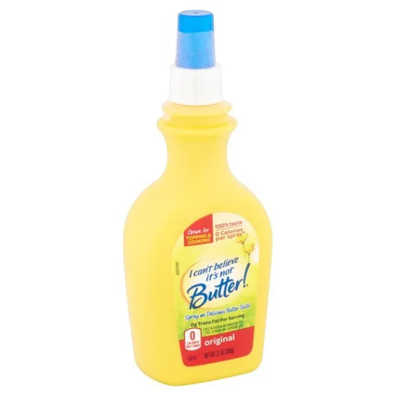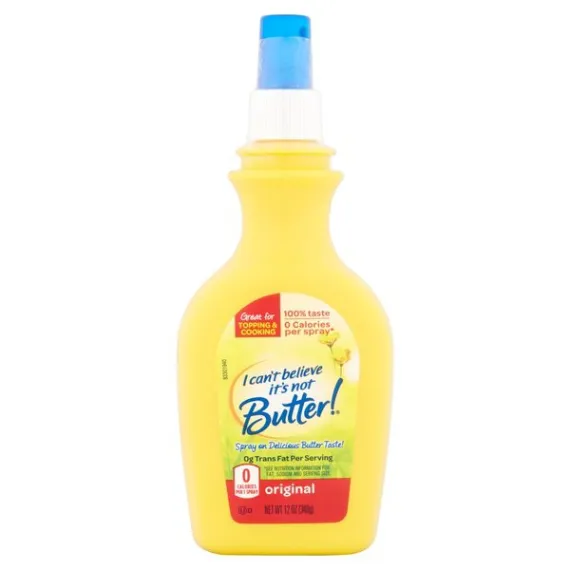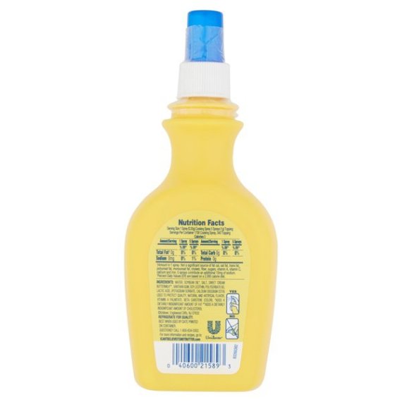 Details Ingredients Water, Soybean Oil*, Salt, Sweet Cream Buttermilk**, Xanthan Gum, Soy Lecithin, Polysorbate 60, Lactic Acid, (Potassium Sorbate, Calcium Disodium EDTA) used to protect quality, Natural and Artifical Flavor, Vitamin A Palmitate, Beta Carotene (Color). Show more Product features Butter Spray, Original, Bottle 12 OZ America's Favorite Butter Spray. 50% more than the 8 oz size. 0 g trans fat per serving (see nutrition information for fat content and serving size). 0 calories per serving. Questions? Call 1-800-634-0302. For more information and recipes, go to: Icantbelieveitsnotbutter.com. Refrigerate for quality. Best when used by date printed on container. 12 oz (340 g) Englewood Cliffs, NJ 07632 800-634-0302 Unilever Cooking Spray, Original America's Favorite Butter Spray. 50% more than the 8 oz size. 0 g trans fat per serving (see nutrition information for fat content and serving size). 0 calories per serving. Questions? Call 1-800-634-0302. For more information and recipes, go to: Icantbelieveitsnotbutter.com. Special Features No trans fat Net Quantity of Content 1700 X 0.2 g