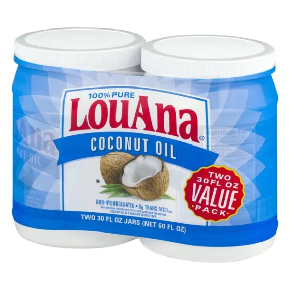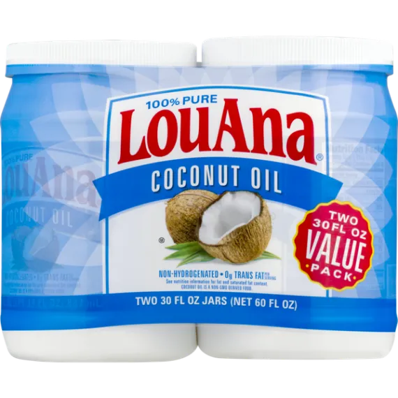 Details Ingredients COCONUT OIL. Product features The LouAna Pure Coconut Oil is ideal for baking, sautéing, moisturizing and more. It is non-GMO derived with no coconut aroma or taste. Try using this non-hydrogenated coconut oil in place of butter or shortening when baking for delicious results. LouAna 100% Pure Coconut Oil: All with no coconut aroma or taste Coconut oil is a non-GMO derived food Best uses: bake, saute, moisturize and more Non-hydrogenated Pack of 2 LouAna coconut oil comes in 30 fl oz jar Net Quantity of Content ABOUT 120 X 1 Tbsp
