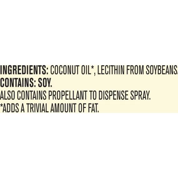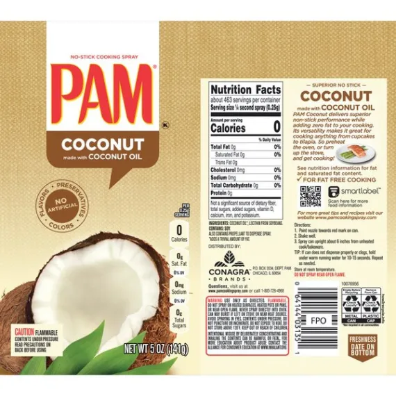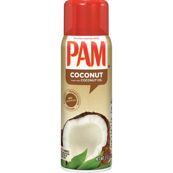 Details Ingredients Coconut Oil*, Lecithin from Soybeans CONTAINS: SOY. Also contains propellant to dispense spray. *Adds a trivial amount of fat. Product features PAM Coconut Oil Cooking Spray is made from non-GMO ingredients. With a subtle taste, this non-hydrogenated coconut oil spray is versatile for almost any dish. Spray PAM Coconut Oil directly on food to lock in flavor and texture, or spray it on pans and skillets for easy cooking and cleanup. With PAM's superior non-stick capabilities, it's perfect for roasting meat and veggies, baking muffins or whipping up an omelet. Enjoy your favorite recipes with PAM Non-GMO Coconut Cooking Spray. Includes one 5-ounce bottle of PAM Non-GMO Coconut Oil Cooking Spray Made with non-hydrogenated coconut oil, this PAM Spray has a neutral taste, allowing it to work well with almost any dish PAM Coconut Oil Spray is perfect for anything, from baking muffins to roasting meats and veggies Spray PAM Coconut Oil directly on food to lock in flavor and texture This non-GMO cooking spray is the perfect complement to your healthy dishes Net Quantity of Content 463.0 X 0.25g