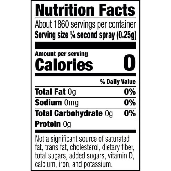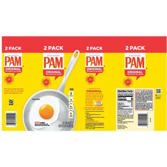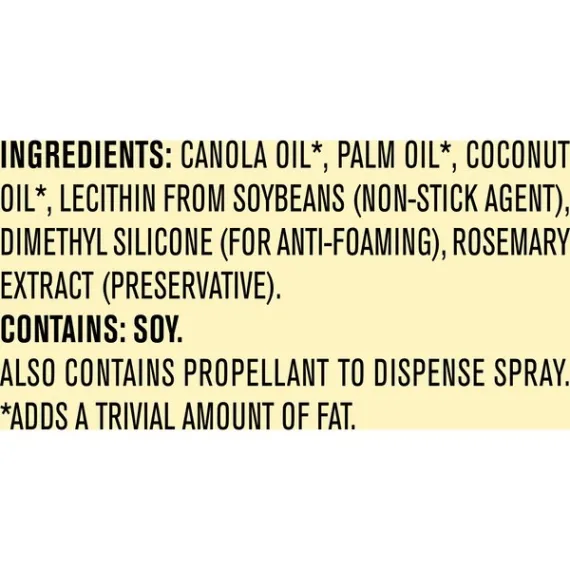 Details Ingredients Canola Oil*, Palm Oil*, Coconut Oil*, Lecithin from Soybeans (Non-Stick Agent), Dimethyl Silicone (For Anti-Foaming), Rosemary Extract (Preservative). CONTAINS: SOY., Contains propellant to dispense spray. *Adds a trivial amount of fat. Show more Product features As the undisputed leader in non-stick cooking sprays, PAM Original has been helping home cooks save precious time since 1961. Our spray oil leaves up to 99% less residue* so you can spend more time enjoying meals and less time cleaning up. * Vs. leading cooking sprays (except olive oil), after spraying on glass bakeware, baking at 400°F for 30 min, cooling, and then washing in standard home dishwasher with detergent and repeating 4 times Contains two 10 oz. cans of PAM Original No-Stick Spray Up to 99% less residue* Prevent foods from sticking to pans and dishes Made with canola oil blend Contains less fat and calories than butter, margarine, and canola oil 0 g trans fat per serving 0 calories per serving Net Quantity of Content 1875.0 X 0.25g
