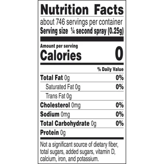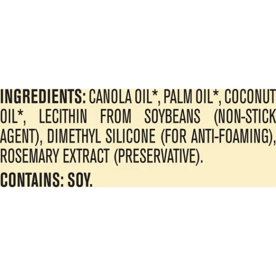 Details Ingredients Canola Oil*, Palm Oil*, Coconut Oil*, Lecithin from Soybeans (Non-Stick Agent), Dimethyl Silicone (For Anti-Foaming), Rosemary Extract (Preservative). CONTAINS: SOY. Also contains propellant to dispense spray. *Adds a trivial amount of fat. Show more Product features As the undisputed leader in non-stick cooking sprays, PAM Original has been helping home cooks save precious time since 1961. Our spray oil leaves up to 99% less residue* so you can spend more time enjoying meals and less time cleaning up. * Vs. leading cooking sprays (except olive oil), after spraying on glass bakeware, baking at 400°F for 30 min, cooling, and then washing in standard home dishwasher with detergent and repeating 4 times Contains one 8 oz. can of PAM Original No-Stick Spray Up to 99% less residue* Prevent foods from sticking to pans and dishes Made with canola oil blend Contains less fat and calories than butter, margarine, and canola oil 0 g trans fat per serving 0 calories per serving Special Features All natural Net Quantity of Content 746.0 X 0.25g