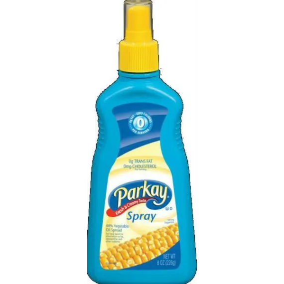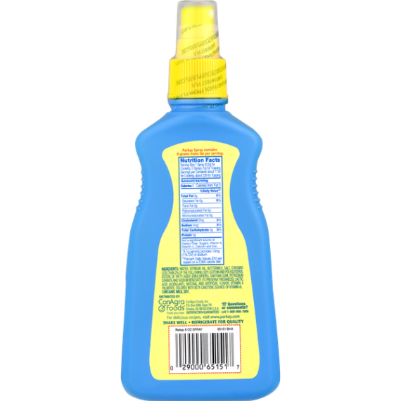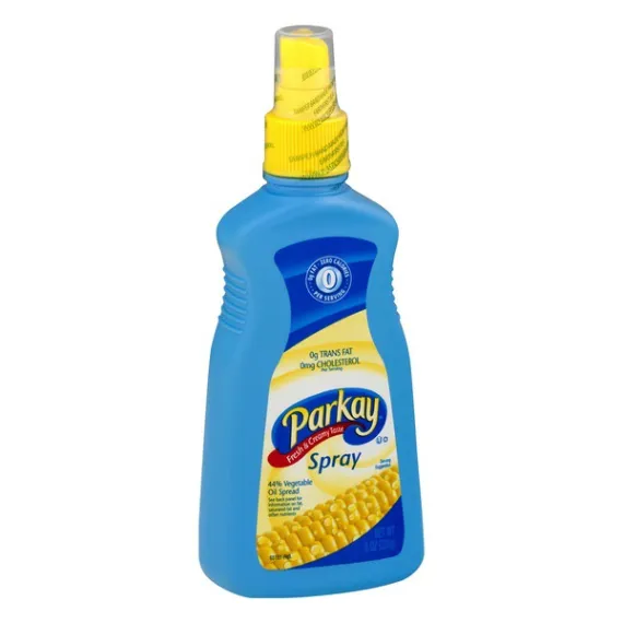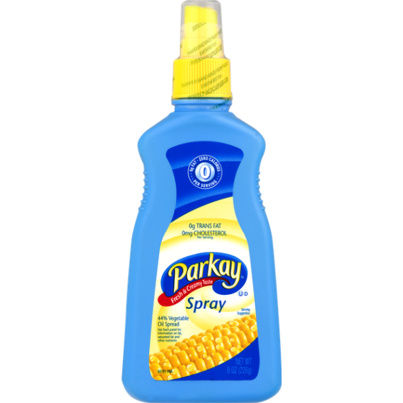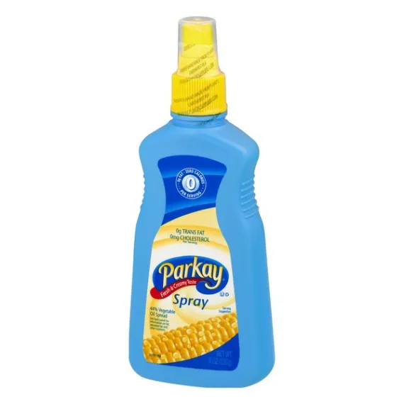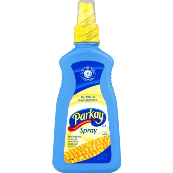 Details Ingredients Water, Soybean Oil, Buttermilk, Salt, Contains less than 2% of the following: Soy Lecithin and Polyglycerol Esters of Fatty Acids (Emulsifiers), Xanthan Gum, Potassium Sorbate and Sodium Benzoate (To Preserve Freshness), Lactic Acid (Acidulant), Natural and Artificial Flavor, Vitamin A Palmitate, Colored with Beta Carotene (Source of Vitamin A). CONTAINS: MILK, SOY. Show more Product features With PARKAY Vegetable Oil Spray, you get the same buttery taste you love, but in a convenient spray bottle. Add this versatile spray to corn straight off the grill or to your freshly popped popcorn. Try the vegetable oil spray as a tasty alternative to butter on chicken, vegetables, potatoes and more. PARKAY Vegetable Oil Spray is simple to use and delicious to eat. Includes one 8-ounce bottle of PARKAY Vegetable Oil Spray Rich, buttery taste in a convenient spray bottle Made to have that creamy butter flavor in spray-form Convenient bottle is perfect for cooking at home or taking on camping trips Add PARKAY Spray to chicken, vegetables, corn, grilled cheese sandwiches and more Special Features Zero calories Net Quantity of Content 1134.0 X 0.2g