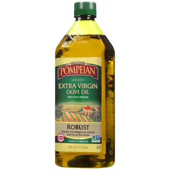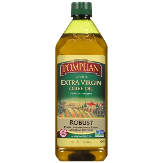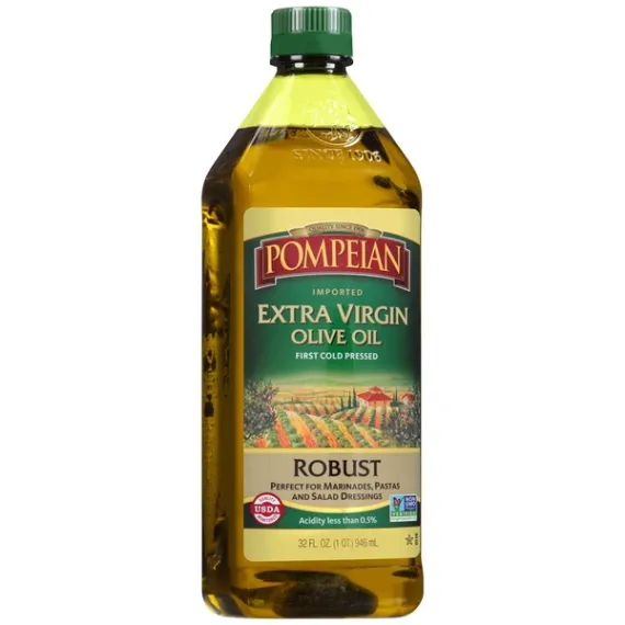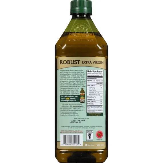 Details Ingredients If oil catches fire, turn off heat and cover until cooled. Do not use water. Product features Olive Oil, Extra Virgin, Robust, Jug 32 OZ Imported. Quality since 1906. First cold pressed. Perfect for marinades, pastas and salad dressings. Quality USDA monitored. Acidity less than 0.5%. Non GMO Project verified. nongmoproject.org. Pompeian works directly with farmers, which ensures that only the finest olives are selected for our oil and allows for full traceability of our products. Our Robust Extra Virgin Olive Oil is extremely low in acidity and has a full-bodied taste perfect for marinades, pastas and salad dressings. Plus, Pompeian Extra Virgin Olive Oil is the first olive oil to attain the USDA Quality Monitored seal, which verifies that it meets the rigorous quality, purity and traceability requirements. It is also certified non-GMO by the Non-GMO Project Organization. For a delicate flavor, also try our new smooth Extra Virgin Olive Oil! For more product information and recipes, visit pompeian.com. For questions or comments, call 1-800-pompeian (1-800-766-7342). Reducing with the carbon trust CO2. carbon-label.com. Naturally gluten free and non-allergenic. American Olive Oil Association. Certified quality naooa.org. Please recycle. Store tightly capped in a cool dark place. This product may become cloudy at about 45 degrees F. Caution: If oil catches fire, turn off heat and cover until cooled. Do not use water. 32 fl oz (1 qt) 946 ml Baltimore, MD 21224 800-POMPEIAN Olive Oil, Extra Virgin, Robust Imported. Quality since 1906. First cold pressed. Perfect for marinades, pastas and salad dressings. Quality USDA monitored. Acidity less than 0.5%. Non GMO Project verified. nongmoproject.org. Pompeian works directly with farmers, which ensures that only the finest olives are selected for our oil and allows for full traceability of our products. Our Robust Extra Virgin Olive Oil is extremely low in acidity and has a full-bodied taste perfect for marinades, pastas and salad dressings. Plus, Pompeian Extra Virgin Olive Oil is the first olive oil to attain the USDA Quality Monitored seal, which verifies that it meets the rigorous quality, purity and traceability requirements. It is also certified non-GMO by the Non-GMO Project Organization. For a delicate flavor, also try our new smooth Extra Virgin Olive Oil! For more product information and recipes, visit pompeian.com. For questions or comments, call 1-800-pompeian (1-800-766-7342). Reducing with the carbon trust CO2. carbon-label.com. Naturally gluten free and non-allergenic. American Olive Oil Association. Certified quality naooa.org. Please recycle. Special Features Robust flavor Net Quantity of Content 64 X 1 Tbsp