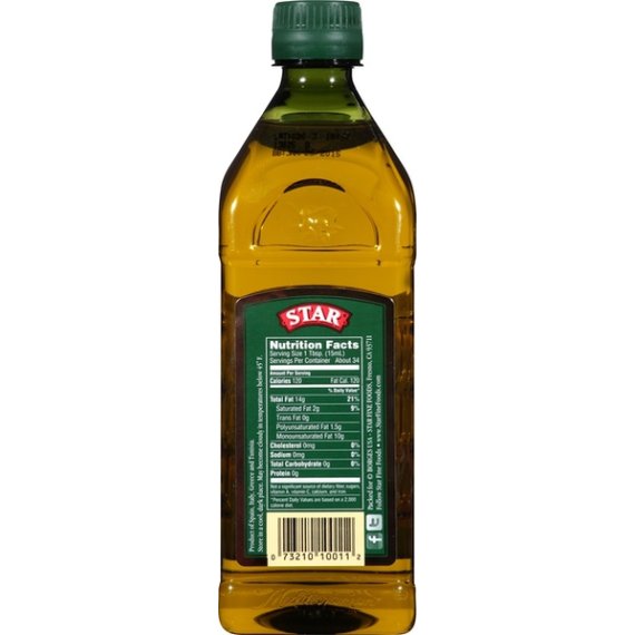 Details Ingredients 100% Extra Virgin Olive Oil Product features Star is a long standing member of NAOOA committed to supporting and promoting olive oil. NAOOA members abide by the International Olive Council, recognized worldwide as the quality standard setting body for olive oil. The NAOOA seal means our olive oil has been tested and exceeds regulatory olive oil standards. Certified Quality: North America Olive Oil Association. Olive oil is rich in monounsaturated fats promoting HDI, (good cholesterol) while lowering LDL (bad cholesterol). Consuming 2 tbsp. of olive oil daily may reduce your risk of heart disease. Carbohydrate free, trans fat free, sodium free, olive oil is one of the pillars of a healthy diet. Using for sauteing, roasting, grilling. Imported since 1898. Add this product to your kitchen and you'll be prepared to make a variety of exciting and healthy dishes. Star Extra Virgin Olive Oil: Rich olive flavor Imported since 1898 Use 100 virgin olive oil for sauteing, roasting, and grilling Cholesterol free Gluten free Kosher organic virgin olive oil Net Quantity of Content 34 X 1 tbsp.