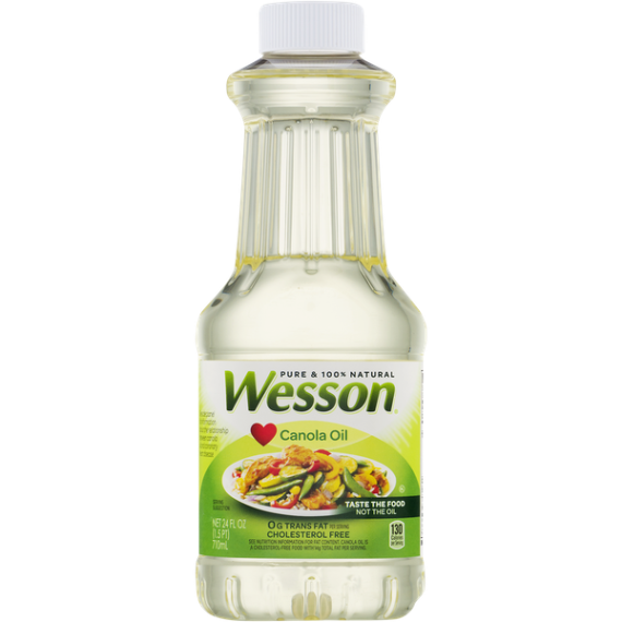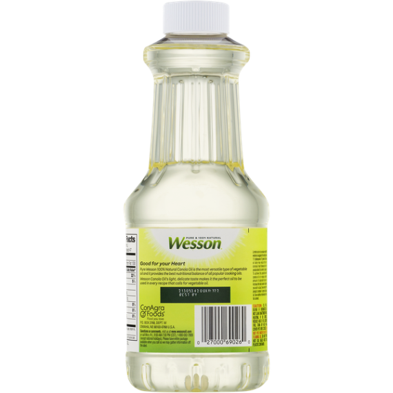 Details Ingredients Canola Oil Product features The versatility and nutritional balance of WESSON Pure Canola Oil make it a necessary staple for every kitchen, and the light, delicate flavor means you taste the food, not the oil. WESSON Pure Canola Oil has 0 grams of trans fat and is cholesterol free. Plus, it's an excellent source for monounsaturated fat, essential for a heart-healthy diet. Purchase a 24-ounce container of canola oil when you're preparing for a family meal or backyard barbeque. Use WESSON Canola Oil to sauté fresh vegetables and lean meats into a delicious stir-fry, or mix it with your favorite spices and herbs for a flavorful marinade or salad dressing. You can also use it as a substitute for melted butter, margarine or shortening when baking your favorite recipes. Order a 24-ounce bottle of WESSON Pure Canola Oil so you're ready to get cooking. Includes one 24-ounce container of WESSON Pure Canola Oil Light, delicate flavor and nutritional value make it an excellent base for marinades and vinaigrettes Highly versatile cooking oil for grilling, baking, frying and more Contains 0 grams of trans fat and is cholesterol free Purchase WESSON Pure Canola Oil so you taste the food, not the oil Special Features Cholesterol free Net Quantity of Content 315.0 X 15mL