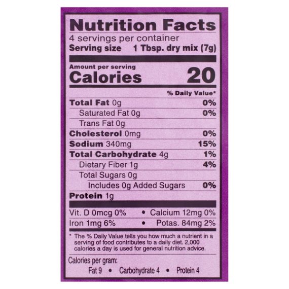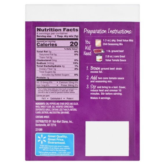 Details Ingredients CHILI PEPPERS AND OTHER SPICES AND COLOR, WHOLE WHEAT FLOUR, SALT, MODIFIED CORNSTARCH, DEHYDRATED GARLIC, CONTAINS LESS THAN 2%: NATURAL FLAVOR, DEXTROSE, MALTODEXTRIN, GUM ARABIC. Show more Product features Perfect that classic chili flavor easily by using Great Value Mild Chili Seasoning Mix. Just add ground beef, tomato sauce, beans, and onion to your skillet or slow cooker to make a perfectly spiced meal. This mild seasoning is not spicy, which makes it suitable for the whole family. Chili night will be a family favorite when you include this easy-to-use one ounce packet. Your hearty chili will be packed with savory and satisfying flavor, all you need to do is top it with your favorites like cheese or sour cream. Don't stock up your spice cabinet with seasonings you won't use very often, simply keep a packet or two of this seasoning to whip-up anytime. Prepare chili for your next tailgate, family gathering, or to serve at a potluck. Enhance your next bowl of chili with delicious Great Value Mild Chili Seasoning Mix. Great Value products provide families with affordable, high quality grocery and household consumable options. With our wide range of product categories spanning grocery and household consumables, we offer you a variety of products for your family's needs. Our products are conveniently available online and in Walmart stores nationwide, allowing you to stock up and save money at the same time. 1oz packet of seasoning Mild spice is perfect for the whole family Easy-to-prepare Simply add beef, tomato sauce and any extras you like Special Features No artificial flavors or colors Net Quantity of Content ABOUT 4 X 1 Tbsp