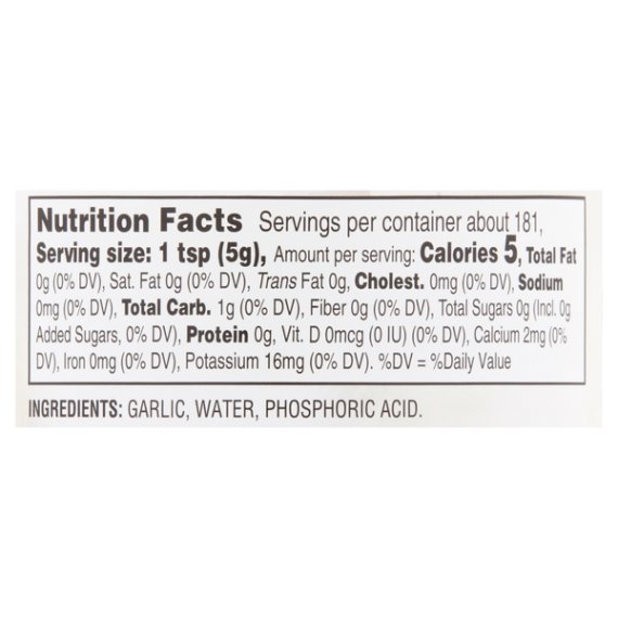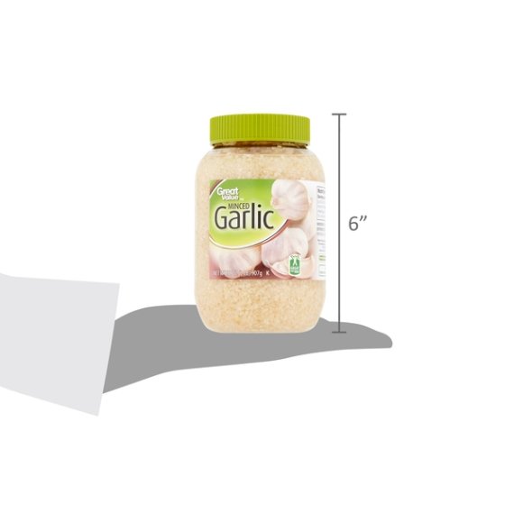 Details Ingredients GARLIC, WATER, CITRIC ACID. Product features Take your culinary creations to the next level with Great Value Minced Garlic. Garlic has been widely cultivated in Middle Asia for centuries, but its exact origins are a mystery. Nowadays, it is grown around the world and considered to be both a pantry staple and a homeopathic health remedy. Garlic's pungent and spicy flavors become caramelized and sweeter when cooked, making it a perfect accompaniment to many dishes such as pasta, shrimp, chicken, soups, and more! Our minced garlic has earned our esteemed Good For You label, which means it has met rigorous nutrition criteria informed by the latest nutrition science and authoritative guidance from the 2010 Dietary Guidelines for Americans, U.S. Food and Drug Administration (FDA), U.S. Department of Agriculture (USDA), and Institute of Medicine (IOM). Spice up your next meal with a tasty teaspoon of our Great Value Minced Garlic. Great Value products provide families with affordable, high quality grocery and household consumable options. With our wide range of product categories spanning grocery and household consumables, we offer you a variety of products for your family's needs. Our products are conveniently available online and in Walmart stores nationwide, allowing you to stock up and save money at the same time. Minced garlic Net weight 32oz (2lb) Good for you Naturally gluten-free food Special Features Minced Net Quantity of Content ABOUT 181 X 1 tsp
