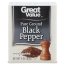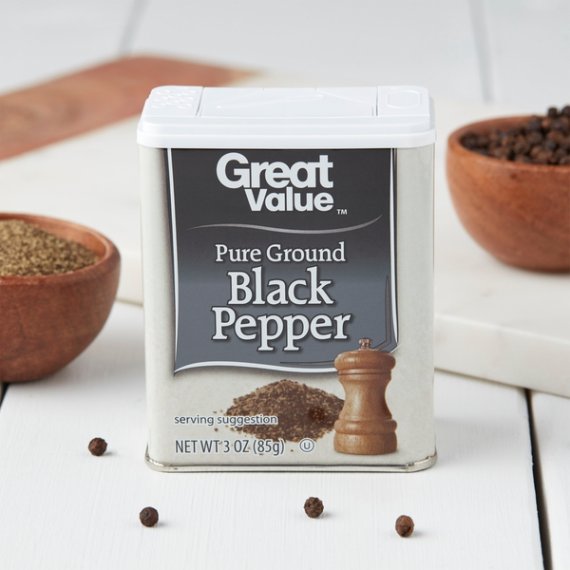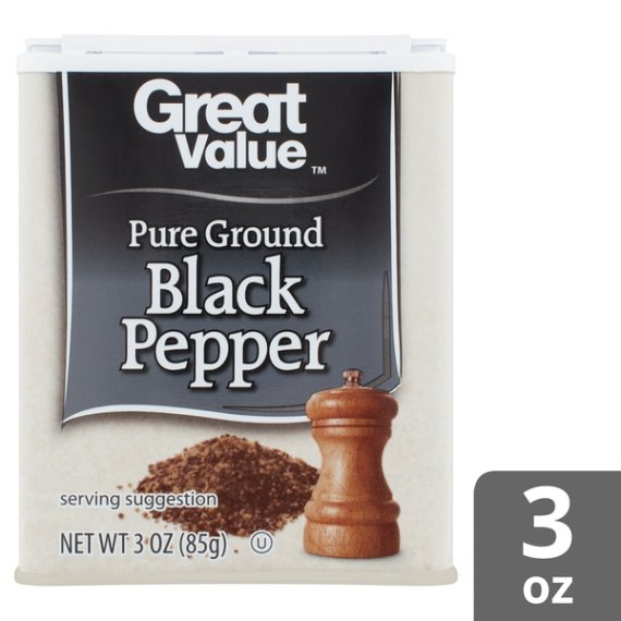Details Ingredients Black Pepper. Product features Add a pinch of spice to your life with Great Value Pure Ground Black Pepper. Black pepper is one of the most commonly used spices in the world. It pairs perfectly with a wide variety of dishes, from lean flank steak to a light tuna salad. Black pepper is even finding its way into sweet recipes such as brownies and cookies, giving a unique and spicy twist to traditional desserts. This 3-ounce container is the perfect companion to salt on your dining room table or kitchen counter, so you can add a quick sprinkle of flavor to your meals anytime. Black pepper may also do more than enhance the flavors of your food; studies have reported that piperine - the ingredient that gives black pepper its spiciness - may decrease inflammation, protect against oxidative stress, and improve brain function. Whenever you feel a dish needs a little something extra, reach for Great Value Pure Ground Black Pepper. Great Value products provide families with affordable, high quality grocery and household consumable options. With our wide range of product categories spanning grocery and household consumables, we offer you a variety of products for your family's needs. Our products are conveniently available online and in Walmart stores nationwide, allowing you to stock up and save money at the same time. Pure ground black pepper 3oz container Excellent flavor enhancer Complements a wide variety of dishes