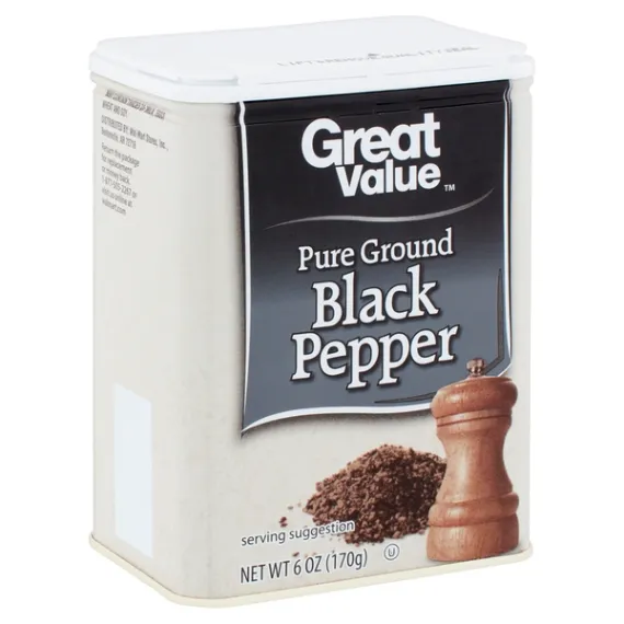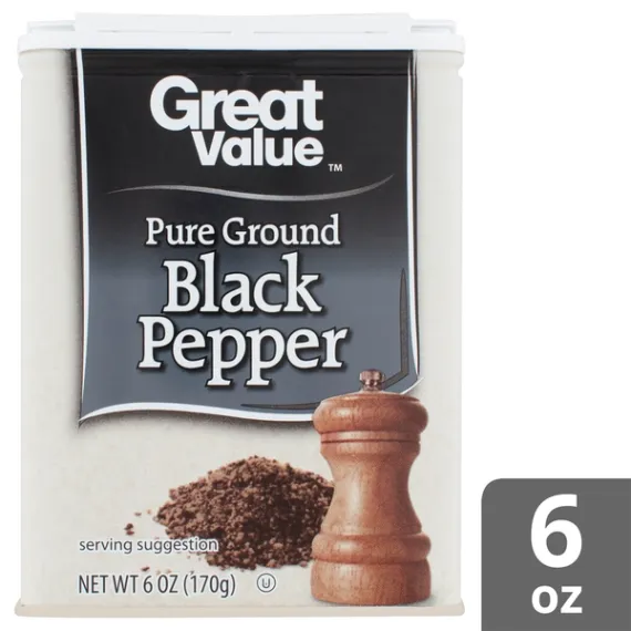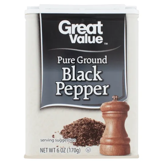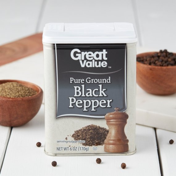 Details Ingredients Black Pepper. Product features Add a pinch of spice to your life with Great Value Pure Ground Black Pepper. Black pepper is one of the most commonly used spices in the world. It pairs perfectly with a wide variety of dishes, from lean flank steak to a light tuna salad. Black pepper is even finding its way into sweet recipes such as brownies and cookies, giving a unique and spicy twist to traditional desserts. This 6-ounce container is the ideal size for your kitchen pantry, so you can add a quick sprinkle of flavor to your meals anytime or have on hand for meal preparation. Black pepper may also do more than enhance the flavors of your food; studies have reported that piperine - the ingredient that gives black pepper its spiciness - may decrease inflammation, protect against oxidative stress, and improve brain function. Whenever you feel a dish needs a little something extra, reach for Great Value Pure Ground Black Pepper. Great Value products provide families with affordable, high quality grocery and household consumable options. With our wide range of product categories spanning grocery and household consumables, we offer you a variety of products for your family's needs. Our products are conveniently available online and in Walmart stores nationwide, allowing you to stock up and save money at the same time. Pure ground black pepper 6oz container Excellent flavor enhancer Complements a wide variety of dishes