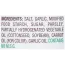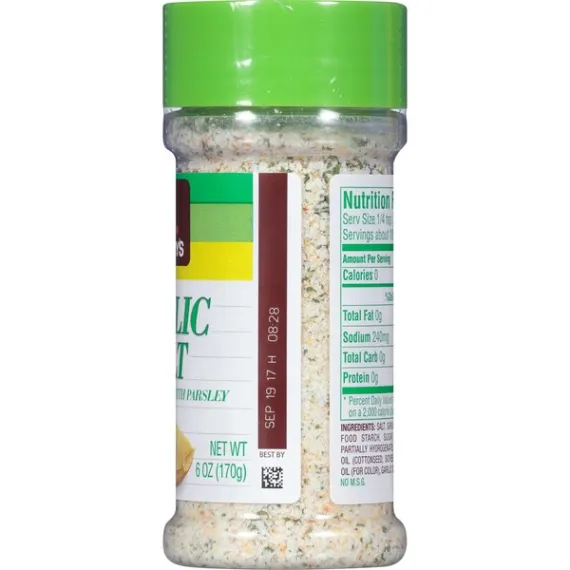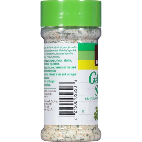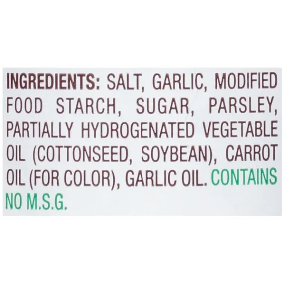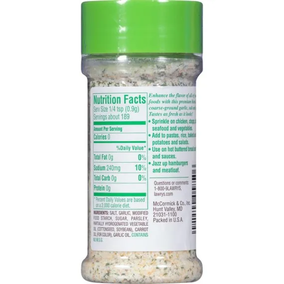 Details Ingredients Salt, Garlic, Modified Food Starch, Sugar, Parsley, Partially Hydrogenated Vegetable Oil (Cottonseed, Soybean), Carrot Oil (For Color), Garlic Oil. Show more Product features Lawry's Garlic Salt features a top-notch blend of powerful seasonings -- coarse-ground garlic, salt and parsley flakes -- in one convenient bottle to add personality to all your favorite recipes. This premium blend enhances dishes like chicken, chops, steaks, seafood, pastas and casseroles with long-lasting, fresh taste. Use it to make ordinary side dishes shine, such as rice, baked and mashed potatoes, salads and French fries. Or jazz up hamburgers and meatloaf by mixing into ground meat. A premium blend of garlic, salt and parsley No MSG Provides long-lasting, fresh taste Enhances chicken, steaks and vegetables Great in dips and on breads Special Features Contains no MSG Net Quantity of Content 189.0 X 0.9