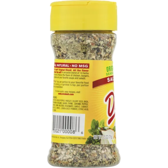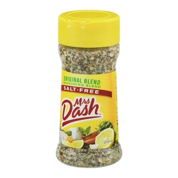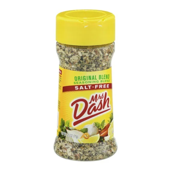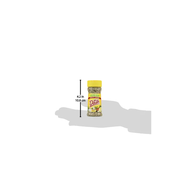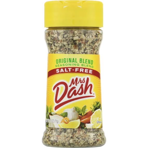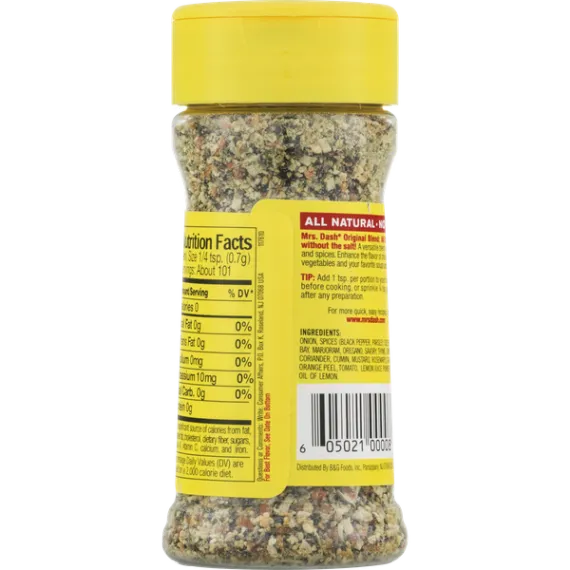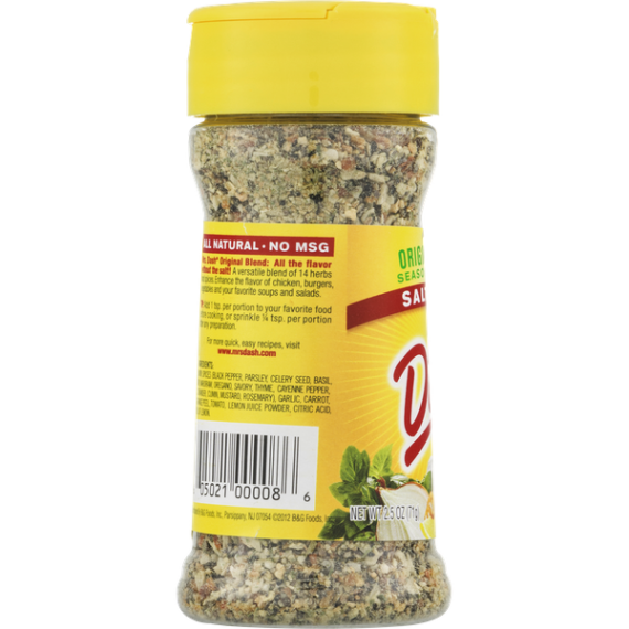 Details Ingredients Onion, Spices (Black Pepper, Parsley, Celery Seed, Basil, Bay, Marjoram, Oregano, Savory, Thyme, Cayenne Pepper, Coriander, Cumin, Mustard, Rosemary), Garlic, Carrot, Orange Peel, Tomato, Lemon Juice Powder, Citric Acid, Oil of Lemon. Show more Product features Wake up food flavor with Mrs. Dash Salt-Free Seasoning. This zesty blend is a fantastic way to enhance flavor without adding salt. Mrs. Dash seasoning features a proprietary blend of 14 herbs and spices that blend effortlessly with an impressive array of foods, from soups and sauces to chicken, burgers, fish, vegetables and salads. The all-natural seasoning contains no calories, no MSG and is certified Kosher for easy eating. It comes in a 2.5 oz container with a shaker cap for effortless use. Mrs. Dash Original Blend Salt-Free Seasoning Blend, 2.5 oz Shaker: Seasoning blend, salt-free, original blend All natural No MSG 0 calories All the flavor without the salt A versatile blend of 14 herbs and spices Kosher-parve Easy to use shaker top Enhance the flavor of chicken, burgers, vegetables and your favorite sauces, soups and salads without adding salt For more quick, easy recipes, visit www.mrsdash.com Blend seasoning, 2.5 oz shaker bottle Net Quantity of Content 101 X 0.699999988079071 g