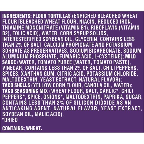 Details Ingredients Ingredients: Wheat Flour, Salt, Garlic*, Chili Peppers*, Spice, Onions*, Maltodextrin, Paprika, Sugar, Contains Less Than 2% Of Silicon Dioxide As An Anticaking Agent, Natural Flavor, Yeast Extract, Soybean Oil, Malic Acid *Dried Show more Product features Taco Bell Crunchy & Soft Taco Dinner Kit will make every night feel like Taco Bell night. The restaurant-quality taco shells and tortillas are made with yellow corn and flour and are paired with delicious taco seasoning and one-of-a-kind Taco Bell Mild Sauce. This kit is sure to make dinner a fiesta and will excite the taste buds of everyone in the family. Simply add ground beef and toppings to complete your Taco Bell dinner. Preparation is easy, brown your ground beef in a skillet, add the seasoning mix along with 3/4 cups of water, and bring to a boil and simmer for 10 minutes. Bake taco shells on baking sheet in the oven for 3-5 minutes, and microwave tortillas for 30 seconds. Dress up your crunchy tacos with sour cream, salsa, shredded lettuce, tomatoes and more. One 12.77 ounce taco kit makes about 6 servings. Make it Taco Bell tonight. One 12.77 Ounce. box of Taco Bell Crunchy & Soft Taco Dinner Kit Create a delicious dinner everyone will love with the Taco Bell Crunchy & Soft Taco Dinner Kit Each box includes 6 crunchy taco shells, 6 soft tortillas, Taco Bell Mild Sauce and taco seasoning Just add ground beef and your favorite toppings Serve with salsa, sour cream, cheese, lettuce, tomatoes and more Net Quantity of Content 6.0 X 1/6pkge (60g/ 1 tortilla, 1 Tbsp sce, 1 taco shell, 2 tsp seasoning
