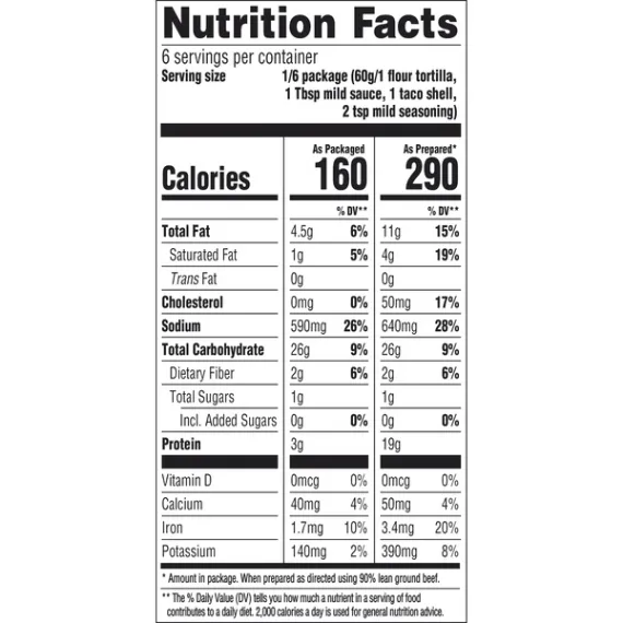 1/6pkge (60g/ 1 tortilla, 1 Tbsp sce, 1 taco shell, 2 tsp seasoning