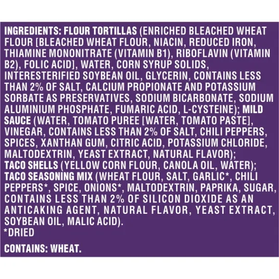 Details Ingredients Ingredients: Wheat Flour, Salt, Garlic*, Chili Peppers*, Spice, Onions*, Maltodextrin, Paprika, Sugar, Contains Less Than 2% Of Silicon Dioxide As An Anticaking Agent, Natural Flavor, Yeast Extract, Soybean Oil, Malic Acid *Dried Show more Product features Taco Bell Crunchy & Soft Taco Dinner Kit will make every night feel like Taco Bell night. The restaurant-quality taco shells and tortillas are made with yellow corn and flour and are paired with delicious taco seasoning and one-of-a-kind Taco Bell Mild Sauce. This kit is sure to make dinner a fiesta and will excite the taste buds of everyone in the family. Simply add ground beef and toppings to complete your Taco Bell dinner. Preparation is easy, brown your ground beef in a skillet, add the seasoning mix along with 3/4 cups of water, and bring to a boil and simmer for 10 minutes. Bake taco shells on baking sheet in the oven for 3-5 minutes, and microwave tortillas for 30 seconds. Dress up your crunchy tacos with sour cream, salsa, shredded lettuce, tomatoes and more. One 12.77 ounce taco kit makes about 6 servings. Make it Taco Bell tonight. One 12.77 Ounce. box of Taco Bell Crunchy & Soft Taco Dinner Kit Create a delicious dinner everyone will love with the Taco Bell Crunchy & Soft Taco Dinner Kit Each box includes 6 crunchy taco shells, 6 soft tortillas, Taco Bell Mild Sauce and taco seasoning Just add ground beef and your favorite toppings Serve with salsa, sour cream, cheese, lettuce, tomatoes and more Net Quantity of Content 6.0 X 1/6pkge (60g/ 1 tortilla, 1 Tbsp sce, 1 taco shell, 2 tsp seasoning