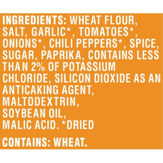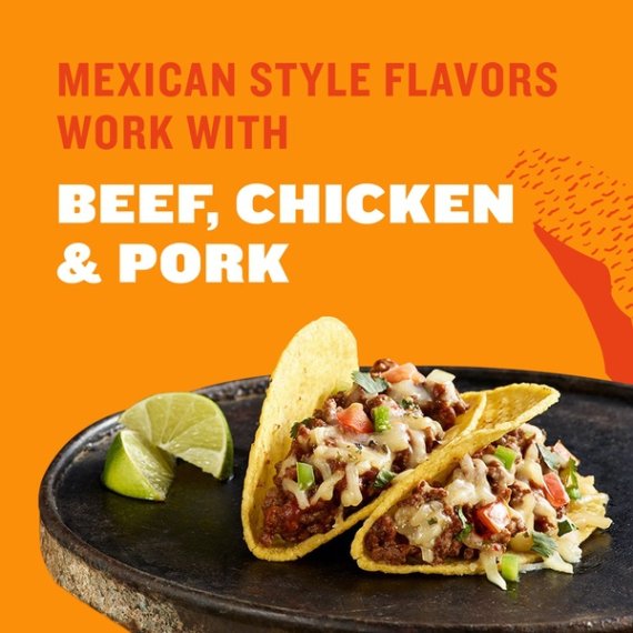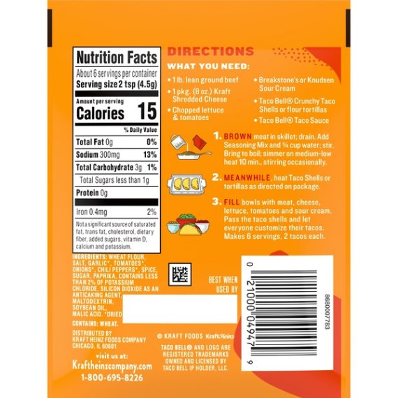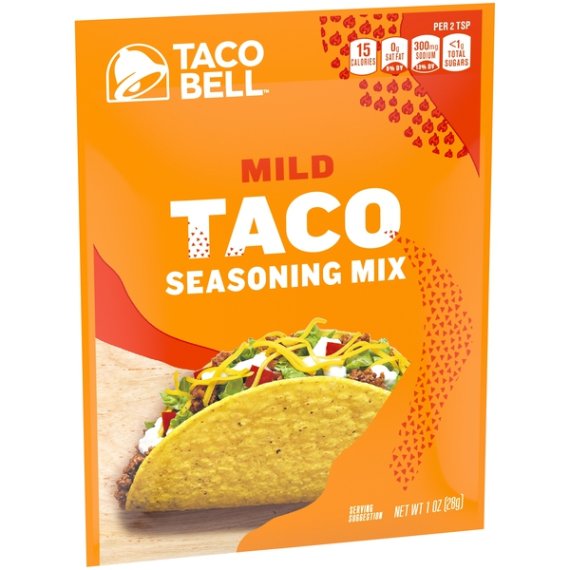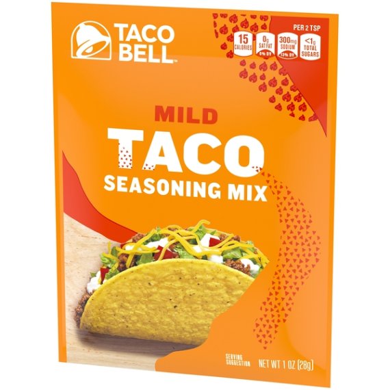 Details Ingredients Ingredients: Wheat Flour, Salt, Spice, Garlic*, Tomatoes*, Onions*, Sugar, Paprika, Contains Less Than 2% Of Potassium Chloride, Maltodextrin, Silicon Dioxide As An Anticaking Agent, Soybean Oil, Malic Acid *Dried Show more Product features Taco Bell Mild Taco Seasoning Mix brings the flavor of Taco Bell to your home with an easy seasoning packet that spices up taco night. This seasoning packet features exciting Mexican style flavors with a mild heat level the whole family can enjoy. Flavor your ground beef, chicken or pork with this seasoning to make your soft tacos or crunchy tacos burst with Taco Bell flavor. After browning your selected meat, add the seasoning mix and water, and let it simmer. This seasoning will add exciting flavor to your dinner and liven up your taste buds, making taco night the best it has ever been. Make it Taco Bell tonight. One 1 oz. envelope of Taco Bell Mild Taco Seasoning Mix Taco Bell Mild Taco Seasoning Mix brings the flavors of Taco Bell into your home Mild flavor seasoning mix is ideal for the whole family Mexican style flavors work with beef, chicken and pork Easy to make by stirring into cooked and drained meat with water Season meat for tacos, burritos and other classic Mexican dishes Packaged in an easy-to-open envelope Net Quantity of Content 6.0 X 2 tsp (4.5g)