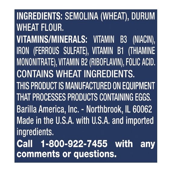 Details Ingredients Semolina (Wheat), Durum Wheat Flour.Vitamins/Minerals: Vitamin B3 (Niacin), Iron (Ferrous Sulfate), Vitamin B1 (Thiamine Mononitrate), Vitamin B2 (Riboflavin), Folic Acid Show more Product features At Barilla, we're passionate about pasta. After all, we have been pasta makers since 1877. As an Italian family-owned food company, Barilla pasta is synonymous with high quality and "al dente" perfection every time. Our Elbows are made from the finest durum wheat and is non-GMO verified, peanut-free and suitable for a vegan or vegetarian diet. Elbows, or "Chifferi" in Italian, are named for their curved, tubular shape. Barilla® Elbows are ridged with an extra curve, giving it a more sophisticated pasta shape that helps to hold the sauce. Barilla® Elbows are crafted with the highest quality Non-GMO durum wheat semolina for a perfect "al dente" texture and delicious flavor. A semi-circle pasta shape with an extra curve to hold sauces. Made with 100% durum wheat and purified water to deliver great taste and "al dente" texture every time. Perfect for American favorites like macaroni & cheese and pasta salad. Special Features Al dente perfection in 7-8 minutes Net Quantity of Content 8 X 2 oz (56g—About 1/8 Box)