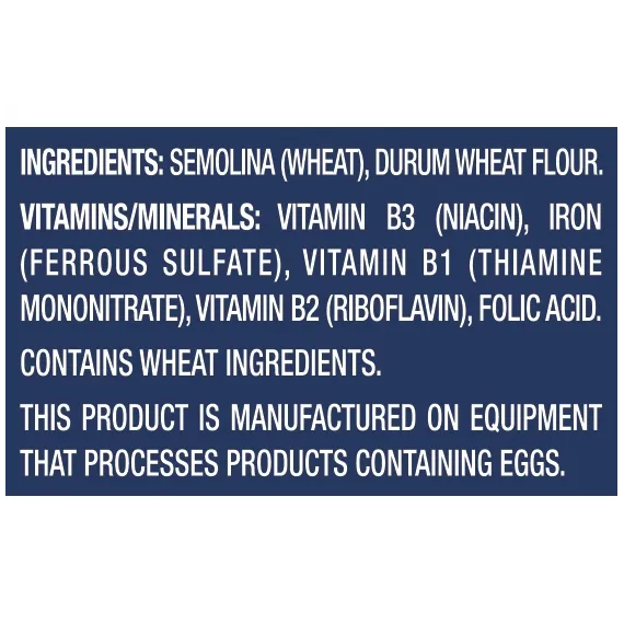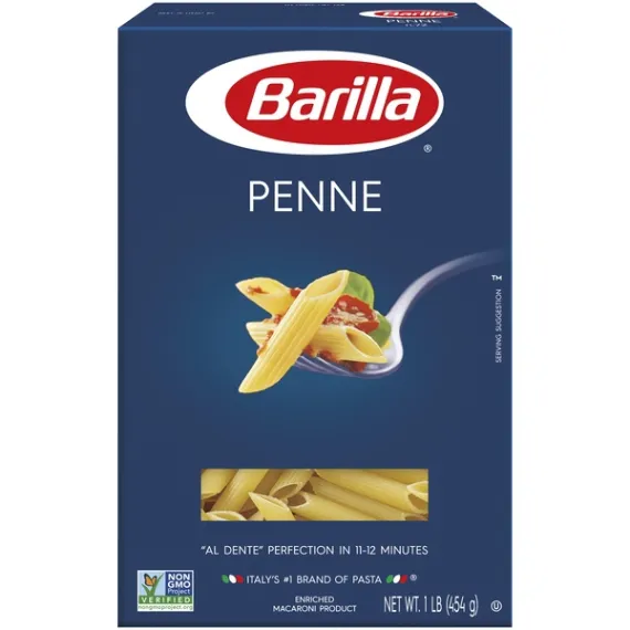 Details Ingredients SEMOLINA (WHEAT), DURUM WHEAT FLOUR. VITAMINS/MINERALS: VITAMIN B3 (NIACIN), IRON (FERROUS SULFATE), VITAMIN B1 (THIAMINE MONONITRATE), VITAMIN B2 (RIBOFLAVIN), FOLIC ACID. Show more Product features At Barilla, we're passionate about pasta. After all, we have been pasta makers since 1877. As an Italian family-owned food company, Barilla pasta is synonymous with high quality and "al dente" perfection every time. Our Penne is made from the finest durum wheat and is non-GMO verified, peanut-free and suitable for a vegan or vegetarian diet. Penne means "pen" in Italian, and is a shape inspired by the quill of an old style ink pen. The beautifully ridged shape of Penne can be served in a variety of ways: with meat- and vegetable-based sauces to olive oil- and dairy-based sauces, or bake it in your favorite pasta casserole. Barilla® Penne is crafted with the highest quality Non-GMO durum wheat semolina for a perfect "al dente" texture and delicious flavor. A versatile, ridged, tube-shaped pasta that works with just about any sauce you prepare it with. Made with 100% durum wheat and purified water to deliver great taste and "al dente" texture every time. Try Penne with a spicy tomato sauce called Penne all'Arrabbiata for a classic Italian favorite. Special Features Enriched Net Quantity of Content ABOUT 8 X 2 oz
