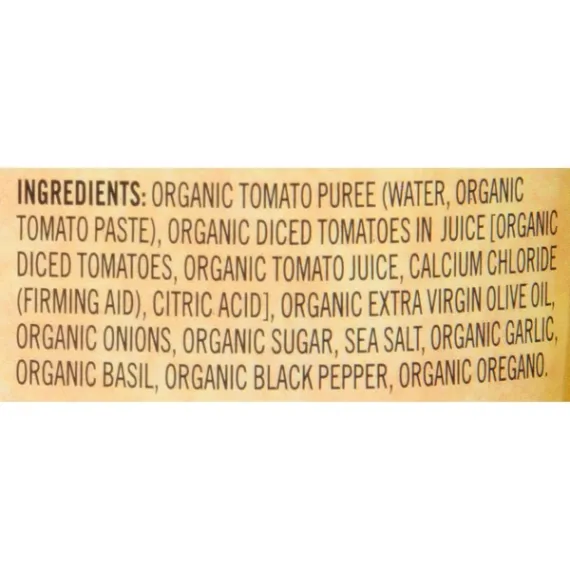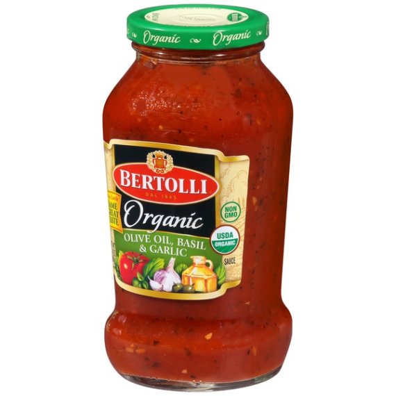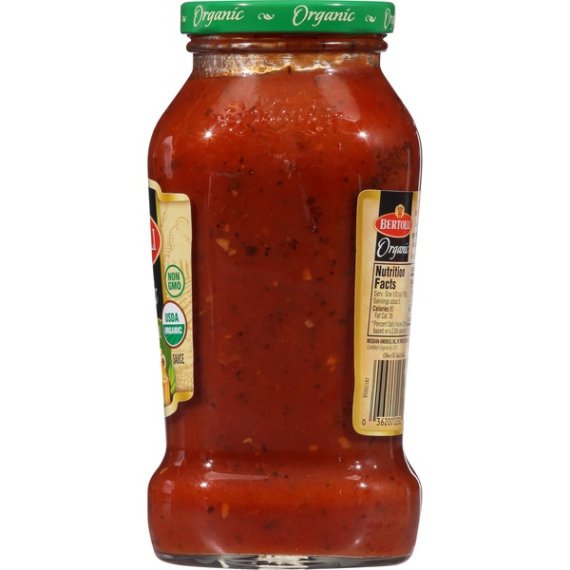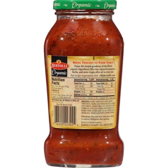Details Ingredients Organic Tomato Puree (Water, Organic Tomato Paste), Organic Diced Tomatoes In Juice [Organic Diced Tomatoes, Organic Tomato Juice, Calcium Chloride (Firming Aid), Citric Acid], Organic Soybean Oil, Organic Sugar, Organic Extra Virgin Olive Oil, Organic Onions, Sea Salt, Organic Garlic, Organic Romano Cheese Made From Cow's Milk (Organic Cultured Part-Skim Milk, Salt, Enzymes), Organic Basil, Organic Black Pepper, Organic Fennel. Contains: Milk Show more Product features Taste our organic pasta sauces, crafted from a fresh crop of vine-ripened, organic tomatoes. Enjoy the authentic taste and organic ingredients poured into every jar. Cook with consciousness. Organic pasta sauce made from vine-ripened tomatoes, basil, fennel and a touch of Romano cheese. For more information go to www.bertolli.com Special Features USDA organic Net Quantity of Content 5 X 1/2 cup (125g)