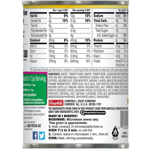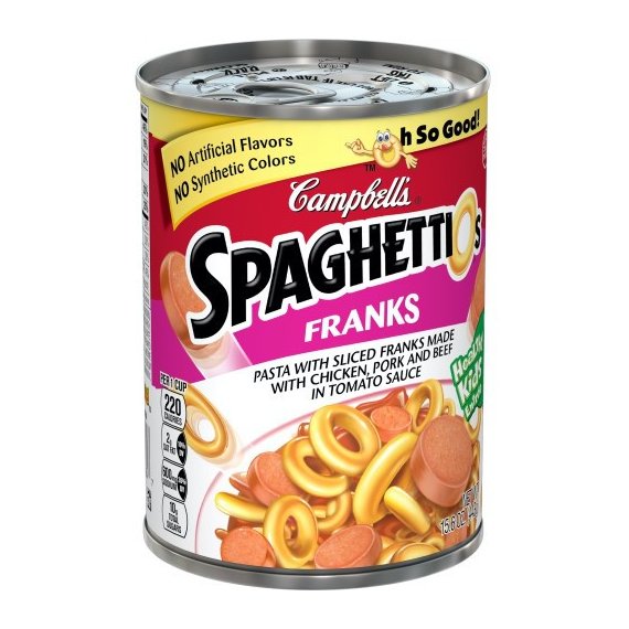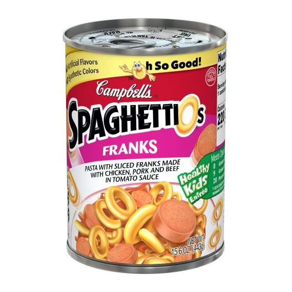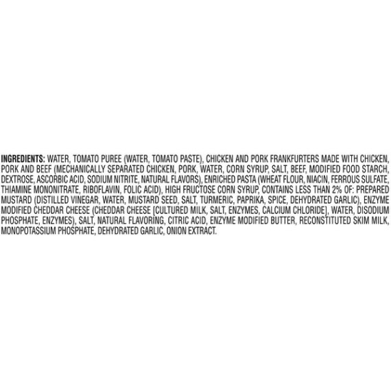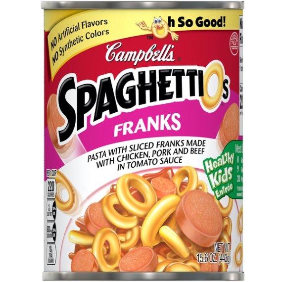 Details Ingredients Ingredients: Water, Tomato Puree (Water, Tomato Paste), Chicken And Pork Frankfurters Made With Chicken, Pork And Beef (Mechanically Separated Chicken, Pork, Water, Corn Syrup, Salt, Beef, Modified Food Starch, Dextrose, Ascorbic Acid, Sodium Nitrite, Natural Flavors), Enriched Pasta (Wheat Flour, Niacin, Ferrous Sulfate, Thiamine Mononitrate, Riboflavin, Folic Acid), High Fructose Corn Syrup, Contains Less Than 2% Of: Prepared Mustard (Distilled Vinegar, Water, Mustard Seed, Salt, Turmeric, Paprika, Spice, Dehydrated Garlic), Enzyme Modified Cheddar Cheese (Cheddar Cheese [Cultured Milk, Salt, Enzymes, Calcium Chloride], Water, Disodium Phosphate, Enzymes), Salt, Natural Flavoring, Citric Acid, Enzyme Modified Butter, Reconstituted Skim Milk, Monopotassium Phosphate, Dehydrated Garlic, Onion Extract. Show more Product features For over 50 years, families have turned to SpaghettiOs pasta for a quick and delicious dish. Campbell's SpaghettiOs with Franks are made with O-shaped pasta in a cheesy tomato sauce with meatballs, packed with 9 grams of protein and 20 % of daily vegetables per 1 cup. Those spoonable little Os are easy and fun for kids to eat… but we don’t blame you for stealing a bite. Be a kid with your kid! A healthy kids entreé made with O-shaped pasta in a tomato and cheese sauce with franks Each 15.6 oz can has 1 serving 9 grams of protein and 20% of daily vegetables per 1 cup No artificial flavors, synthetic colors, or added preservatives Great for a quick and easy afternoon snack Net Quantity of Content 1.0 X 1 CONTAINER