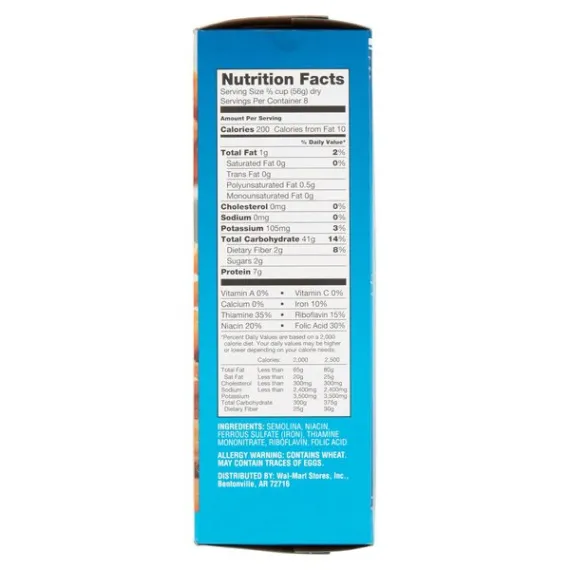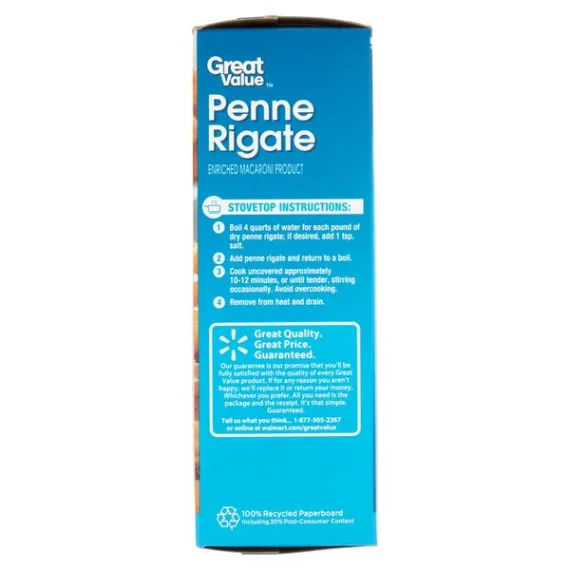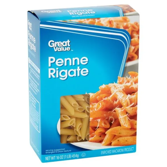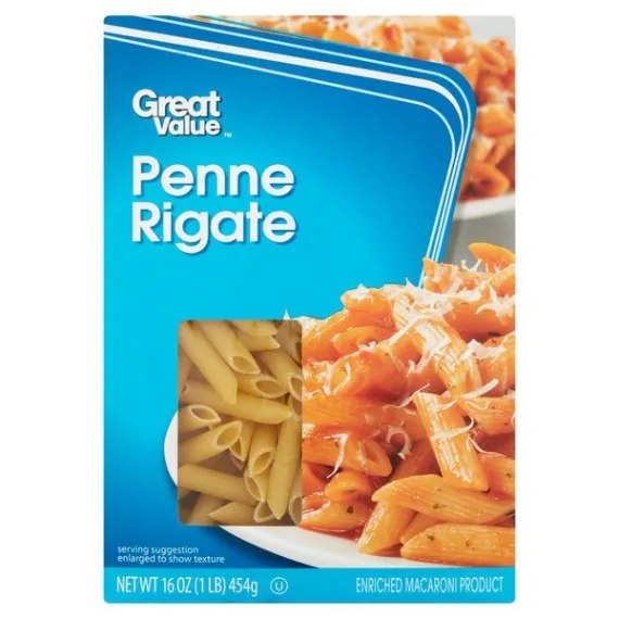 Details Ingredients Semolina , Niacin, Ferrous Sulfate (Iron), Thiamine Mononitrate, Riboflavin, Folic Acid Product features Create a wide variety of savory pasta dishes with this handy box of Great Value Penne Rigate Pasta. Each serving features up to 7 grams of protein with 2 grams of fiber and only 210 calories. This Great Value pasta is ideal for red and white sauces alike. Great Value: Penne Rigate Pasta, 16 oz: Durum semolina, niacin, iron Enriched semolina pasta, 16 oz macaroni product 0 grams trans fat Special Features Trans fat Net Quantity of Content 8 X 56 G