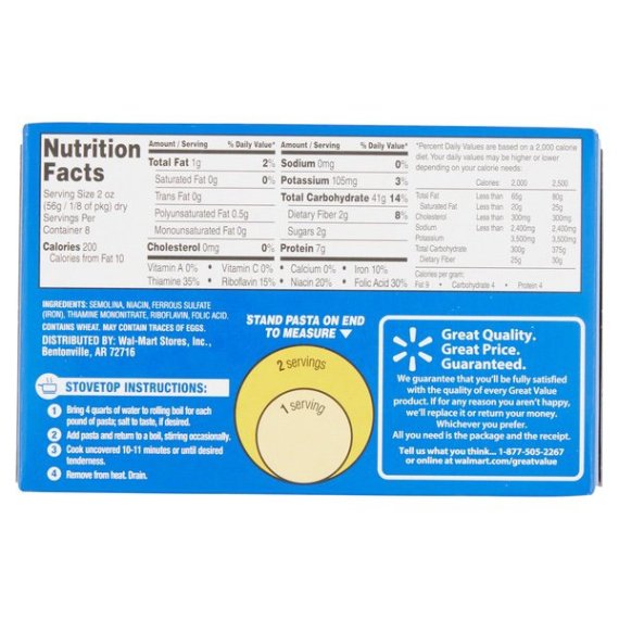 Details Ingredients SEMOLINA, NIACIN, FERROUS SULFATE (IRON), THIAMINE MONONITRATE, RIBOFLAVIN, FOLIC ACID. Product features Enriched Macaroni Product Product Features One pound half length pasta Kosher walmart.com/greatvalue Net Quantity of Content 8 X 2 oz