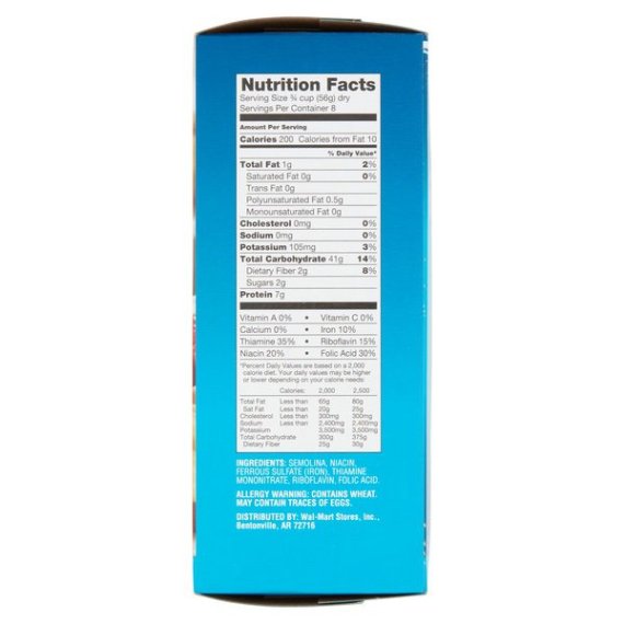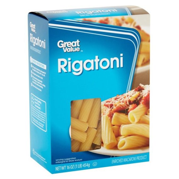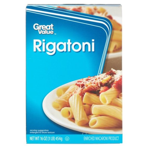 Details Ingredients SEMOLINA, NIACIN, FERROUS SULFATE (IRON), THIAMINE MONONITRATE, RIBOFLAVIN, FOLIC ACID. Product features Durum semolina, niacin, iron. Enriched macaroni product. Kosher. No artificial flavors or colors. Warnings: Contains Wheat. May Contain Traces Of Eggs. Ingredients: Durum Semolina, Niacin, Ferrous Sulfate (Iron), Thiamin Mononitrate, Riboflavin, Folic Acid. Great Value Rigatoni, 16 Oz Special Features Enriched macaroni product Net Quantity of Content 8 X 0.75 cup