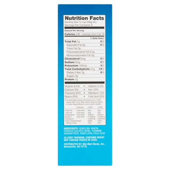 Details Ingredients SEMOLINA, NIACIN, FERROUS SULFATE (IRON), THIAMINE MONONITRATE, RIBOFLAVIN, FOLIC ACID. Product features Enriched Macaroni Product Our Great Value Rotini Pasta is an ideal base for hot and cold pasta dishes. Available in a 16-ounce size, one box can yield a delicious dinner for eight people in just ten minutes! Ideal for easy weeknight meals, you need only add pasta sauce, steamed vegetables, basil, and grated parmesan for a complete dinner the entire family will enjoy. As an enriched macaroni product, you'll get the added benefits of essential nutrients like folic acid, riboflavin, thiamine, and niacin. Get cooking with Great Value Rotini Pasta! Great Value products provide families with affordable, high quality grocery and household consumable options. With our wide range of product categories spanning grocery and household consumables, we offer you a variety of products for your family's needs. Our products are conveniently available online and in Walmart stores nationwide, allowing you to stock up and save money at the same time. Kosher Special Features 0G trans fat Net Quantity of Content 8 X 0.75 cup
