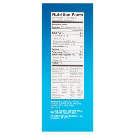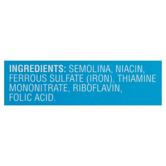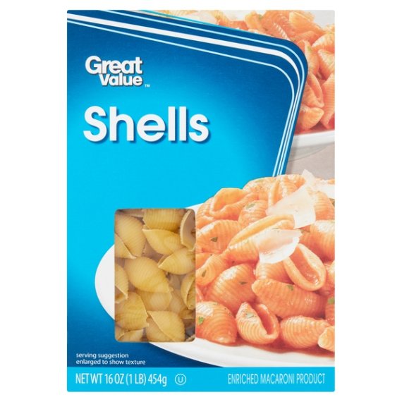 Details Ingredients SEMOLINA, NIACIN, FERROUS SULFATE (IRON), THIAMINE MONONITRATE, RIBOFLAVIN, FOLIC ACID. Product features Enriched Macaroni Product For delectable hot and cold pasta dishes, try Great Value Shells Pasta. Available in a 16-ounce size, one box can yield a delicious dinner for eight people in just ten minutes. Serve warm with tomato basil sauce for a weeknight dinner or try it chilled with cold shrimp, dill, and a sweet and spicy mustard sauce at lunchtime. The possibilities are limited only by your imagination! As an enriched macaroni product, you'll gain the added benefits of essential nutrients. Make Great Value Shells Pasta a pantry staple in your home. Great Value products provide families with affordable, high quality grocery and household consumable options. With our wide range of product categories spanning grocery and household consumables, we offer you a variety of products for your family's needs. Our products are conveniently available online and in Walmart stores nationwide, allowing you to stock up and save money at the same time. Kosher Special Features 0G trans fat Net Quantity of Content 8 X 0.75 cup