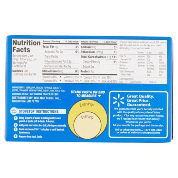 Details Ingredients Semolina, niacin, ferrous sulfate, thiamine mononitrate, riboflavin, folic acid Product features Great Value Spaghetti Pasta is a great addition to any wholesome meal. Boiling water brings this pasta to life, making it ready to eat with only a few steps of preparation. This product goes great with spaghetti sauce and meatballs, and is a great addition to any family get together. The convenient tab on the top of the box also allows you to open and close it with ease, allowing you to keep certain amounts of the dried pasta for later use. Spaghetti is similar to angel hair pasta as well, making it a great interchangeable form of pasta for any dish that may call for angel hair pasta. Liven up your dinners today with Great Value Spaghetti Pasta. Great Value products provide families with affordable, high-quality grocery and household consumable options. With our wide range of product categories spanning grocery and household consumables, we offer you a variety of products for your family's needs. Our products are conveniently available online and in Walmart stores nationwide, allowing you to stock up and save money at the same time Great Value Spaghetti Pasta, 4 count 1 lb packages: Perfect for your next party Long, thin, and scrumptious Great alternative to other types of pasta Just add boiling hot water Delicious with sauce and meatballs Delectable Net Quantity of Content 6 X 2 oz