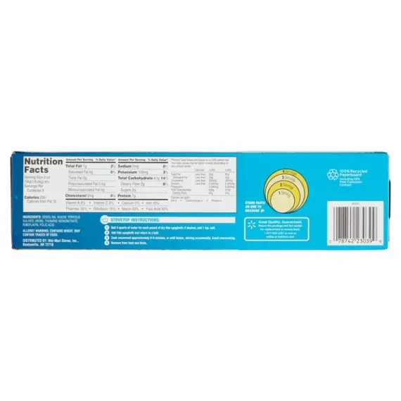 Details Ingredients SEMOLINA, NIACIN, FERROUS SULFATE (IRON), THIAMINE MONONITRATE, RIBOFLAVIN, FOLIC ACID. Product features Thin Spaghetti Product Features Enriched spaghetti product Kosher Packing - Recyclable 100% recycled paperboard Including 30% post-consumer content walmart.com Special Features 0G trans fat Net Quantity of Content 8 X 2 oz