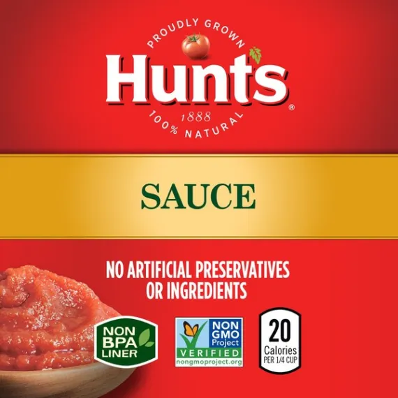 Details Ingredients Tomato Puree (Water, Tomato Paste), Water, Less than 2% of: Salt, Citric Acid, Onion Powder, Garlic Powder, Red Pepper. Product features Savor the home-cooked goodness of your family's favorite recipes with Hunt's Tomato Sauce. Taste the difference in pastas, meatballs, and more with Hunt's vine-ripened tomato flavors. Simmered with salt, spices, and natural seasonings, Hunt's sauces add a rich, smooth texture to recipes. No compromise, Hunt's Tomato Sauce is 100% natural, with no artificial preservatives. Hunt's doesn't use sugar, corn syrup, or other sweeteners in its canned tomato sauces. Contains 8 oz of sauce; 20 calories per serving. Hunt's tomatoes are picked at the peak of ripeness, because great tasting meals start with great ingredients. Taste the difference in pastas, meatballs, and more with Hunt's vine-ripened tomato flavors Simmered with salt, spices, and natural seasonings, Hunt's sauces add a rich, smooth texture to recipes No compromise, Hunt's Tomato Sauce is 100% natural, with no artificial preservatives Hunt's doesn't use sugar, corn syrup, or other sweeteners in its canned tomato sauces Contains 8 oz of sauce; 20 calories per serving Special Features 100% natural Net Quantity of Content 3.5 X 62g