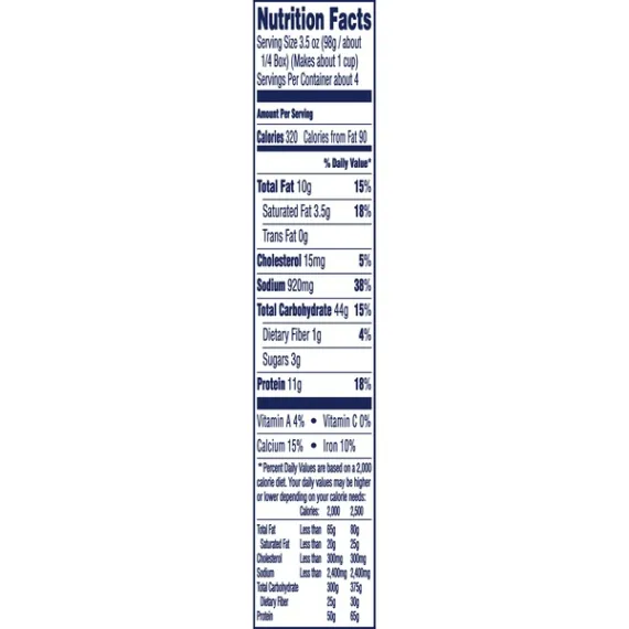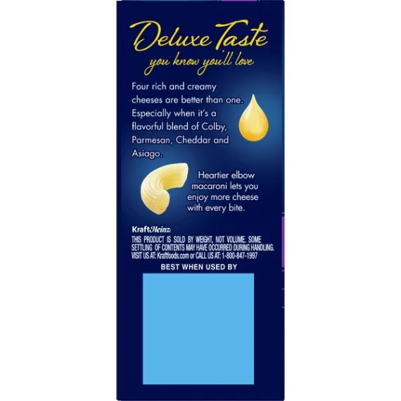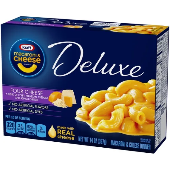 Details Ingredients Ingredients: Enriched Macaroni Product (Wheat Flour, Niacin, Ferrous Sulfate [Iron], Thiamin Mononitrate [Vitamin B1], Riboflavin [Vitamin B2], Folic Acid); Cheese Sauce (Whey, Colby Cheese [Milk, Cheese Culture, Salt, Enzymes, Annatto (Color)], Parmesan Cheese [Part Skim Milk, Cheese Culture, Salt, Enzymes], Canola Oil, Cheddar Cheese [Milk, Cheese Culture, Salt, Enzymes], Asiago Cheese [Part Skim Milk, Cheese Culture, Salt, Enzymes], Sodium Phosphate, Milk, Salt, Contains Less Than 2% Of Milk Protein Concentrate, Whey Protein Concentrate, Milkfat, Sodium Alginate, Sorbic Acid As A Preservative, Lactic Acid, Oleoresin Paprika [Color], Annatto Extract [Color], Natural Flavor, Cheese Culture) Show more Product features Kraft Deluxe Four Cheese Mac and Cheese Dinner is an easy dinner for the whole family to enjoy. Made with a blend of real Colby, parmesan, cheddar and asiago cheeses, kids and adults love the rich taste and creamy texture of elbow macaroni with cheesy goodness. The box includes elbow pasta and four cheese sauce so you have everything you need to make a quick dinner. With no artificial flavors or artificial dyes, deluxe mac and cheese always makes a good family meal. Preparing boxed mac and cheese is a breeze just boil the noodles for 11 to 12 minutes, drain the water and stir in the cheese mix. Try dressing up this dish by adding sausage and peppers, chicken or tuna and peas, or use it to make bacon-broccoli mac & cheese bites. One 14 ounce box makes about 4 servings. One 14 Ounce. box of Kraft Deluxe Four Cheese Macaroni and Cheese Dinner Kraft Deluxe Four Cheese Macaroni and Cheese Dinner is a quick and easy meal Box includes elbow macaroni noodles and four cheese sauce made with real cheese Contains no artificial flavors and no artificial dyes Dress up the dish by adding sausage and peppers, chicken or tuna and peas Net Quantity of Content 4.0 X 3.5 oz (98g / about 1/4 Box)
