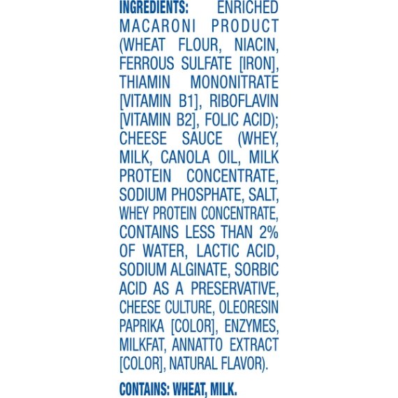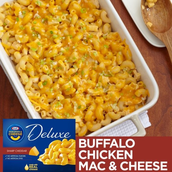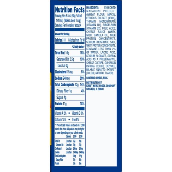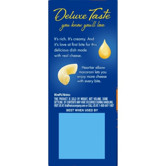 Details Ingredients Enriched Macaroni Product (Wheat Flour, Niacin, Ferrous Sulfate [Iron], Thiamin Mononitrate [Vitamin B1], Riboflavin [Vitamin B2], Folic Acid); Cheese Sauce (Whey, Milk, Canola Oil, Milk Protein Concentrate, Sodium Phosphate, Salt, Whey Protein Concentrate, Contains Less Than 2% Of Water, Lactic Acid, Sodium Alginate, Sorbic Acid As A Preservative, Cheese Culture, Oleoresin Paprika [Color], Enzymes, Milkfat, Annatto Extract [Color], Natural Flavor) Show more Product features Kraft Deluxe Original Cheddar Mac and Cheese Dinner is an easy dinner for the whole family to enjoy. Made with real cheese, kids and adults love the rich taste and creamy texture of elbow macaroni with cheesy goodness. The box includes elbow pasta and original cheddar cheese sauce so you have everything you need to make a quick mac and cheese dinner. With no artificial flavors or artificial dyes, deluxe mac and cheese always makes a good family meal. Preparing boxed mac and cheese is a breeze just boil the noodles for 11 to 12 minutes, drain the water and stir in the cheese mix. Try dressing up this dish by adding broccoli, chicken or ham and peas, or use it as a delicious topping on a mac and cheese pizza. One 14 ounce box makes about 4 servings. One 14 oz. box of Kraft Deluxe Original Cheddar Macaroni and Cheese Dinner Kraft Deluxe Original Cheddar Macaroni and Cheese Dinner is a quick and easy meal Box includes elbow macaroni noodles and original cheddar cheese sauce made with real cheese Contains no artificial flavors and no artificial dyes Dress up the dish by adding broccoli, chicken or ham and peas One box makes about 4 servings Macaroni noodles and cheese sauce are individually sealed Net Quantity of Content 4.0 X 3.5 oz (98g / about 1/4 Box) (Makes about 1 Cup)