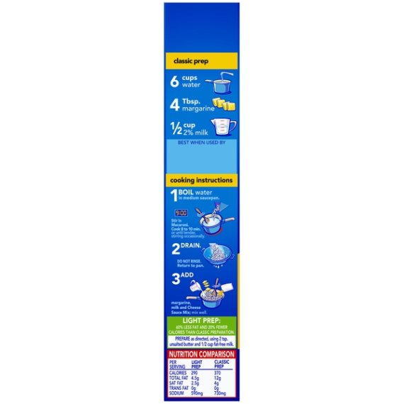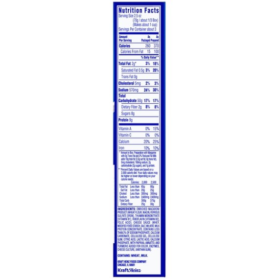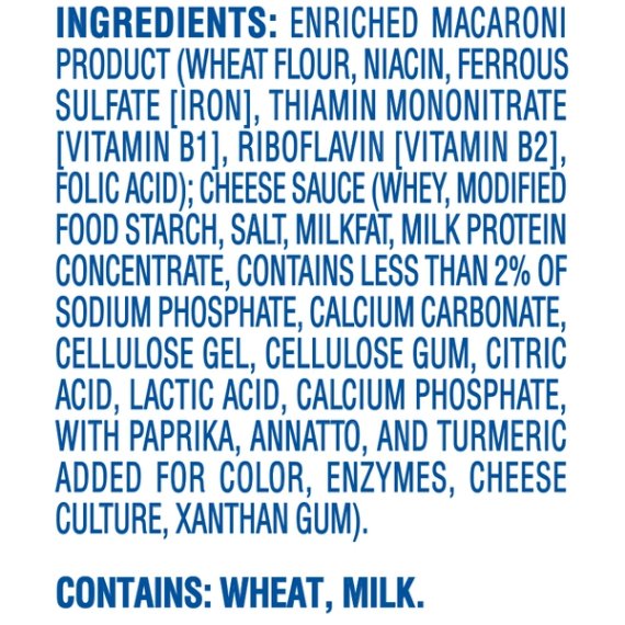 Details Ingredients Ingredients: Enriched Macaroni Product (Wheat Flour, Niacin, Ferrous Sulfate [Iron], Thiamin Mononitrate [Vitamin B1], Riboflavin [Vitamin B2], Folic Acid); Cheese Sauce (Whey, Modified Food Starch, Salt, Milkfat, Milk Protein Concentrate, Contains Less Than 2% Of Sodium Phosphate, Calcium Carbonate, Cellulose Gel, Cellulose Gum, Citric Acid, Lactic Acid, Calcium Phosphate, With Paprika, Annatto, And Turmeric Added For Color, Enzymes, Cheese Culture, Xanthan Gum). Show more Product features Kraft Thick and Creamy Mac and Cheese Dinner is a convenient boxed dinner. A delicious twist on a classic comfort food, kids and adults love the rich taste of mac pasta mixed with thick and creamy cheddar cheesy goodness. This easy dinner includes macaroni pasta and thick'n creamy cheddar cheese sauce mix, so you just need milk and margarine or butter to make a tasty lunch or dinner. With no artificial flavors, no artificial preservatives and no artificial dyes, thick mac and cheese always makes a great family dinner choice. Preparing boxed mac and cheese is a breeze just boil the noodles for 8 to 10 minutes, drain the water and stir in the cheese mix, milk and margarine or butter. One 7.25 ounce box makes about 3 servings. One 7.25 oz. box of Kraft Thick and Creamy Macaroni and Cheese Dinner Kraft Thick and Creamy Macaroni and Cheese Dinner is a convenient boxed dinner Box includes macaroni pasta and thick'n creamy cheddar cheese sauce mix Contains no artificial flavors, preservatives or dyes One box makes about 3 servings Boxed macaroni and cheese is a quick and easy family meal Macaroni noodles and cheese sauce mix are individually sealed Special Features Thick 'n creamy Net Quantity of Content 3.0 X 2.5 oz (70g / about 1/3 Box) (Makes about 1 cup)