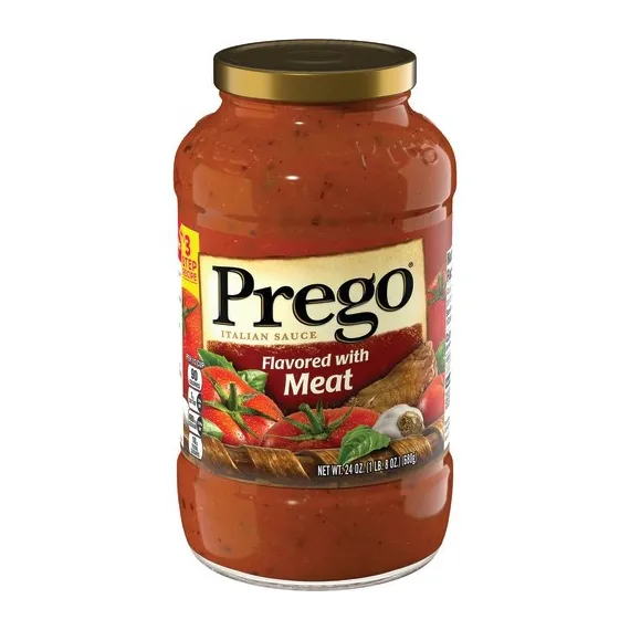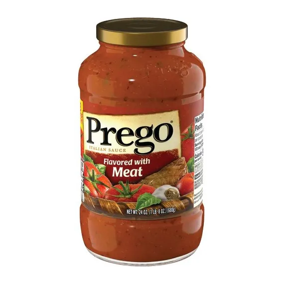 Details Ingredients Ingredients: Tomato Puree (Water, Tomato Paste), Diced Tomatoes In Tomato Juice, Sugar, Beef, Canola Oil, Contains Less Than 1% Of: Salt, Spices, Citric Acid, Dehydrated Onions, Dehydrated Garlic, Beef Fat, Flavoring, Dehydrated Beef Stock, Onion Extract, Garlic Extract, Beef Extract, Yeast Extract. Show more Product features Prego Italian Tomato Sauce Flavored with Meat gives a savory boost to the rich, sweet taste of vine-ripened tomatoes balanced with flavorful meat, herbs and seasonings. Use this combination on pasta or as a base for your own family-pleasing recipes. Try this tomato sauce in your next spaghetti and meatballs, chicken parmesan, or bolognese for a new quick and easy take on your favorite dishes. Visit prego.com/recipes for more recipe inspiration! Prego pasta sauces are made with savory herbs and seasonings you can taste in every bite. Whether you’re in the mood for a zesty tomato sauce or a rich, creamy Alfredo sauce-Prego brings irresistible taste your whole family will love. And with a variety of sauces to feed every diet, there's something for everyone at the table. DELICIOUS TOMATO MEAT SAUCE: Sweet vine-ripened tomatoes are flavored with savory meat and blended with Italian herbs and seasonings for a rich flavor that is authentically Italian GLUTEN FREE PASTA SAUCE: Made almost entirely of vegetables, this spaghetti sauce is naturally gluten free and low in fat LOADED WITH VEGGIES: With tomatoes as the number one ingredient, it's no wonder each half cup serving delivers 40% of your daily vegetables QUICK & EASY DINNERS: Pour it over pasta, use it as a base for your own recipe, or add it to a family favorite FEED THE WHOLE FAMILY: One jar is 67 ounces, easily enough for multiple dinners or a potluck Special Features 100% natural Net Quantity of Content 5.0 X 1/2 CUP (120 mL)