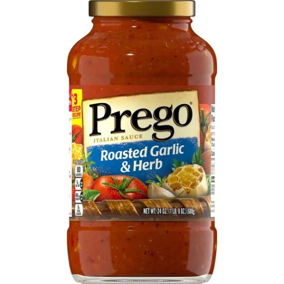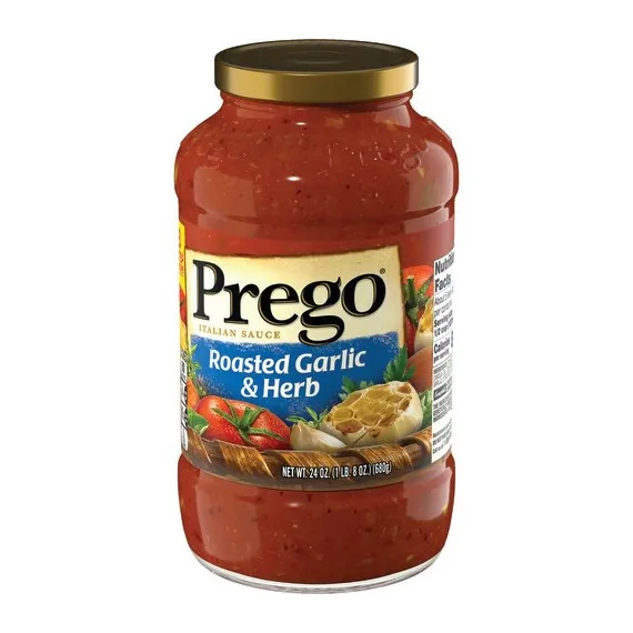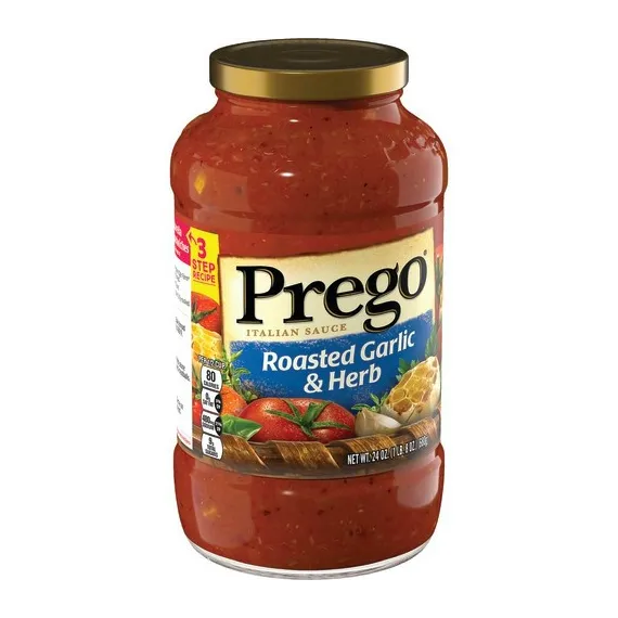 Details Ingredients Ingredients: Tomato Puree (Water, Tomato Paste), Diced Tomatoes In Tomato Juice, Sugar, Canola Oil, Dehydrated Onions, Contains Less Than 1% Of: Salt, Dehydrated Roasted Garlic, Citric Acid, Spices, Dehydrated Garlic, Onion Extract, Flavoring, Garlic Extract. Show more Product features Prego Roasted Garlic and Herb Italian Tomato Sauce gives a kick of garlic with herbs. You’ll love the flavor as is, or as the base for your own pasta sauce. Try this tomato sauce in your next spaghetti and meatballs, chicken parmesan, or bolognese for a new quick and easy take on your favorite dishes. Visit prego.com/recipes for more recipe inspiration! Prego pasta sauces are made with savory herbs and seasonings you can taste in every bite. Whether you’re in the mood for a zesty tomato sauce or a rich, creamy Alfredo sauce-Prego brings irresistible taste your whole family will love. And with a variety of sauces to feed every diet, there's something for everyone at the table. FLAVORFUL TOMATO SAUCE: Made with sweet, vine-ripened tomatoes that are blended with roasted garlic and herbs for a savory taste that is authentically Italian GLUTEN FREE PASTA SAUCE: Made almost entirely of vegetables, this spaghetti sauce is naturally gluten free and low in fat LOADED WITH VEGGIES: With tomatoes as the number one ingredient, it's no wonder each half cup serving delivers 40% of your daily vegetables QUICK & EASY DINNERS: Pour it over pasta, use it as a base for your own recipe, or add it to a family favorite FEED THE WHOLE FAMILY: One jar is 24 ounces, easily enough for a dinner for five (and leftovers!) Special Features 100% natural Net Quantity of Content 5.0 X 1/2 CUP (120 mL)