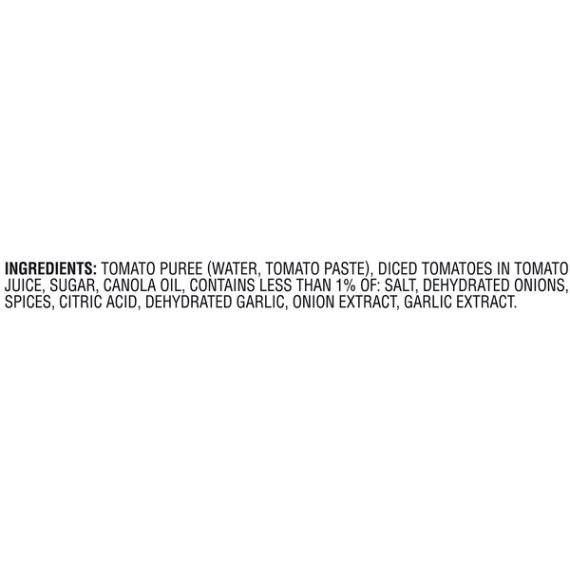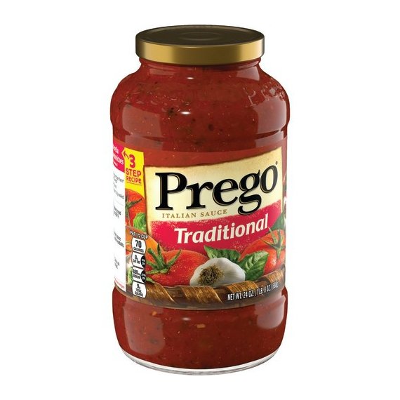 Details Ingredients Ingredients: Tomato Puree (Water, Tomato Paste), Diced Tomatoes In Tomato Juice, Sugar, Canola Oil, Contains Less Than 1% Of: Salt, Dehydrated Onions, Spices, Citric Acid, Dehydrated Garlic, Onion Extract, Garlic Extract. Show more Product features Prego Traditional Pasta Sauce features the rich, sweet flavor of vine-ripened tomatoes balanced with savory herbs and seasonings. Simply pour over pasta or use this classic to transform pantry ingredients into plenty of family-pleasing recipes. Try this tomato sauce in your next spaghetti and meatballs, chicken parmesan, or bolognese for a new quick and easy take on your favorite dishes. Visit prego.com/recipes for more recipe inspiration! Prego pasta sauces are made with savory herbs and seasonings you can taste in every bite. Whether you’re in the mood for a zesty tomato sauce or a rich, creamy Alfredo sauce-Prego brings irresistible taste your whole family will love. And with a variety of sauces to feed every diet, there's something for everyone at the table. CLASSIC TOMATO SAUCE: Sweet vine-ripened tomatoes are blended with Italian herbs and seasonings for a balanced and rich flavor that is authentically Italian Ragu users preferred the taste of Prego Traditional over Ragu Old World Style Traditional, 2 to 1 GLUTEN FREE PASTA SAUCE: Made almost entirely of vegetables, this spaghetti sauce is naturally gluten free and low in fat LOADED WITH VEGGIES: With tomatoes as the number one ingredient, it's no wonder each half cup serving delivers 40% of your daily vegetables FEED THE WHOLE FAMILY: One jar is 24 ounces, easily enough for a dinner for five Special Features 100% natural Net Quantity of Content 5.0 X 1/2 CUP (120 mL)