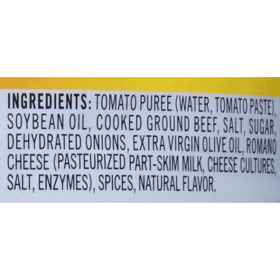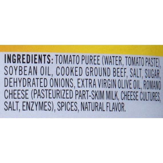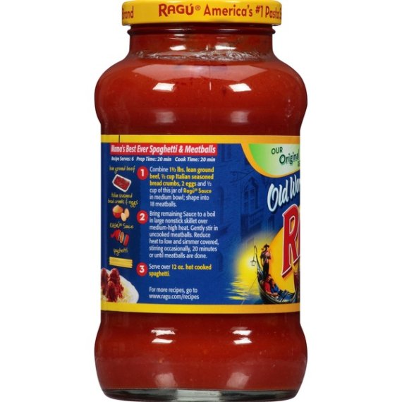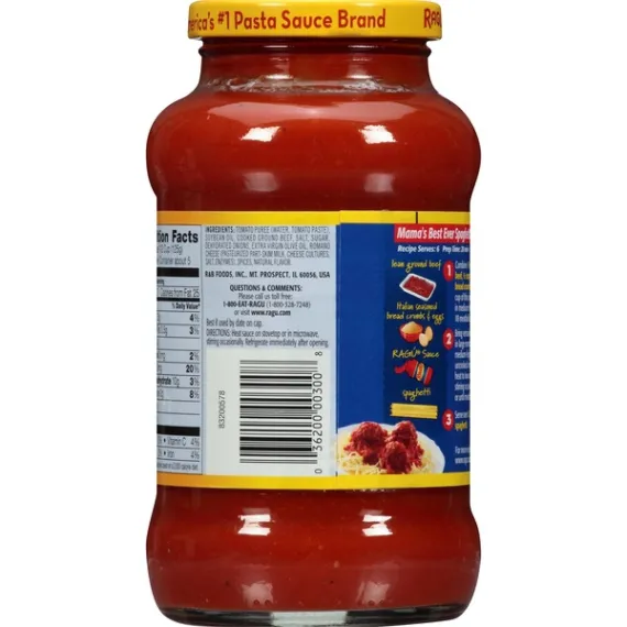 Details Ingredients Tomato Puree (Water, Tomato Paste), Soybean Oil, Cooked Ground Beef, Salt, Sugar, Dehydrated Onions, Extra Virgin Olive Oil, Romano Cheese Made From Cow’s Milk (Cultured Part-Skim Milk, Salt, Enzymes), Spices, Natural Flavor. Show more Product features Complete your dish with the well-rounded taste of RAGÚ® Old World Style® Meat Sauce, crafted with farm-grown tomatoes and Italian seasonings. Ragu Old World Style Flavored with Meat Pasta Sauce 23.9-oz Glass Jar: Made with vine-ripened tomatoes and beef for a delicious meaty sauce Sauce that is slowly simmered in tradition for a classic that families crave. Available in 14oz, 24oz, 45oz and 66oz jars Special Features 100% natural Net Quantity of Content 5 X 125.0