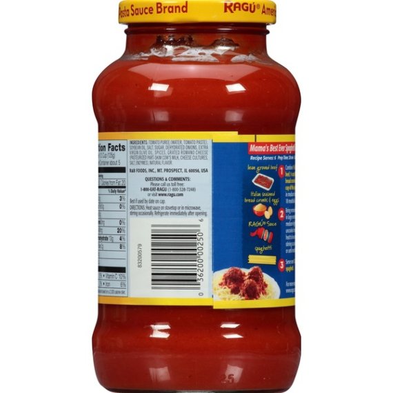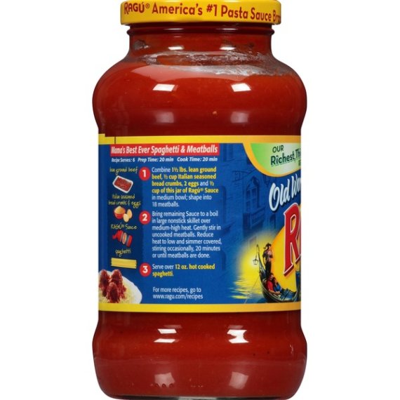 Details Ingredients Tomato Puree (Water, Tomato Paste), Soybean Oil, Salt, Sugar, Dehydrated Onions, Extra Virgin Olive Oil, Spices, Natural Flavors. Product features Enjoy the taste of our heritage with RAGÚ® Old World Style® Traditional spaghetti sauce. A classic pasta sauce crafted with vine-ripened tomatoes and well-storied passion. Ragu Old World Style Traditional Pasta Sauce, 24 oz: Made with vine-ripened tomatoes and a traditional taste that has become a family favorite Sauce that is slowly simmered in tradition for a classic that families crave Contains two servings of vegetables in every 1/2 cup of sauce Available in 14oz, 24 oz, 45oz and 66oz jars Special Features 100% natural Net Quantity of Content 5 X 1/2 Cup. (125g)