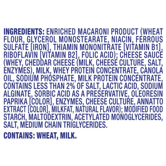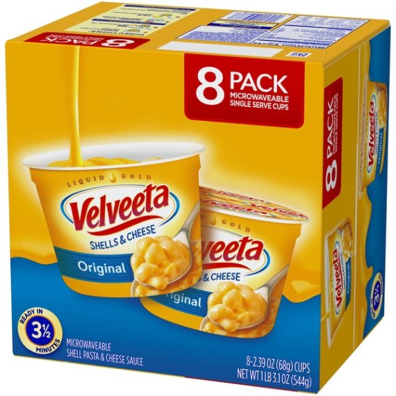 Details Ingredients Ingredients: Enriched Macaroni Product (Wheat Flour, Glycerol Monostearate, Niacin, Ferrous Sulfate [Iron], Thiamin Mononitrate [Vitamin B1], Riboflavin [Vitamin B2], Folic Acid); Cheese Sauce (Whey, Cheddar Cheese (Milk, Cheese Culture, Salt, Enzymes), Milk, Whey Protein Concentrate, Canola Oil, Sodium Phosphate, Milk Protein Concentrate, Contains Less Than 2% Of Salt, Lactic Acid, Sodium Alginate, Sorbic Acid As A Preservative, Oleoresin Paprika [Color], Enzymes, Cheese Culture, Annatto Extract [Color], Milkfat, Natural Flavor); Modified Food Starch, Maltodextrin, Acetylated Monoglycerides, Salt, Medium Chain Triglycerides. Show more Product features Full Velveeta cheese flavor without the wait. Each cup contains our signature Velveeta Shells & Cheese Pasta, made with real cheese, miniaturized into a single serving. Easy macaroni and cheese makes for a delicious and simple addition to any meal. It’s portable enough to toss in your bag or car—one cup might even fit in your pocket. Its convenient size matches its ease of preparation: Simply toss in a microwave for 3 ½ minutes to start digging into Velveeta liquid gold. 8 ct Box of Velveeta Original Shells & Cheese Microwavable Cups Ready in a mere 3 ½ minutes Convenient to pack for lunch at school, the office or as an on-the-go snack This macaroni and cheese requires only a microwave to prepare Made with our special Velveeta cheese Net Quantity of Content 8.0 X 1 Package (68g)
